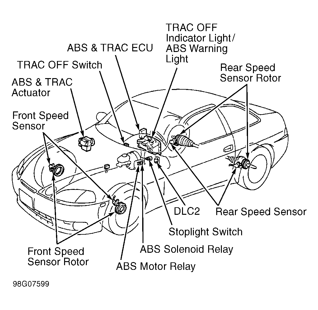 Anti-Lock Brake System (ABS) controls brake fluid pressures to each individual front and rear brake caliper during a panic stop to prevent wheel lock-up. System consists of actuator, solenoid relay, pump motor relay, Electronic Control Unit (ECU), and a speed sensor at each wheel. If a system fault occurs, the ECU stores a self-diagnostic code(s) that can be retrieved to diagnose malfunction. Some models are equipped with an optional Traction Control (TRAC) system, which is integrated with the ABS system. See Fig 1 or Fig 2 .