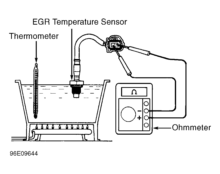 Remove ECT sensor. See REMOVE/INSTALL/OVERHAUL article. With sensing portion of ECT sensor submerged in water, measure resistance between terminals. See Figure. Replace ECT sensor if resistance is not as specified. See ECT SENSOR RESISTANCE  table.