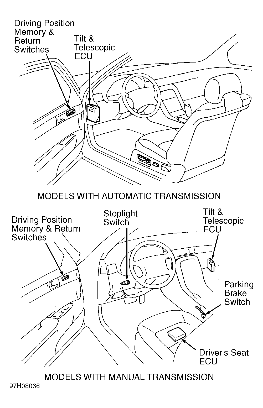 Power tilt steering column system components are: automatic set switch, key unlock warning switch, manual switch, memory and return switches, telescopic motor, telescopic lock motor, telescopic position sensor, tilt and telescopic control module, tilt motor and tilt position sensor. To locate system components, see Fig 1 and Fig 2 .
