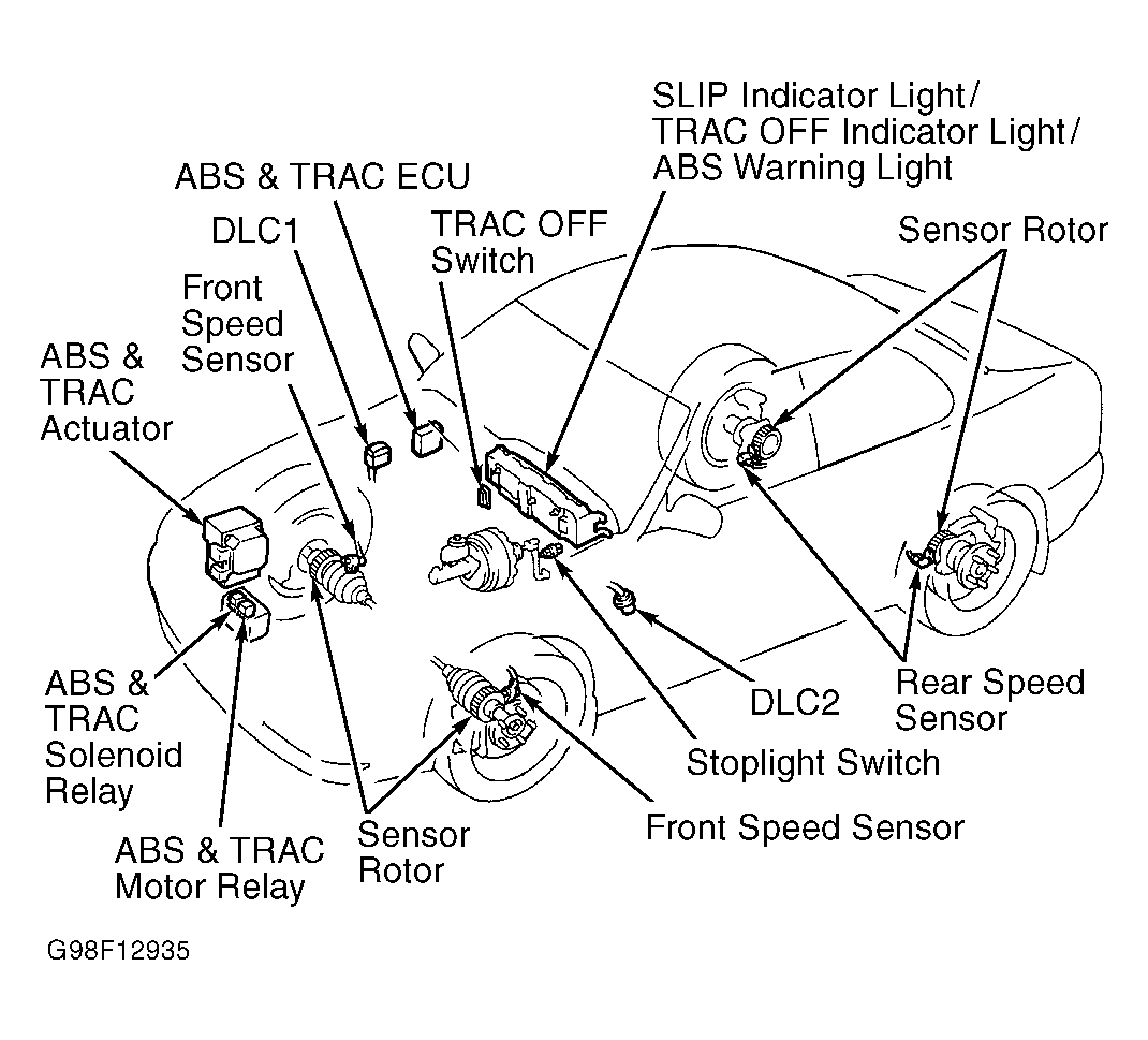 Anti-Lock Brake System (ABS) controls fluid pressures to each individual front brake caliper and rear brake calipers during a panic stop to prevent wheel lock-up. System consists of actuator, solenoid relay, pump motor relay, Electronic Control Unit (ECU), and a speed sensor at each wheel. See Fig 1. If a system fault occurs, the ECU stores a self-diagnostic code(s) that can be retrieved to diagnose malfunction. Some models are equipped with an optional Traction Control (TRAC) system, which is integrated with the ABS system.