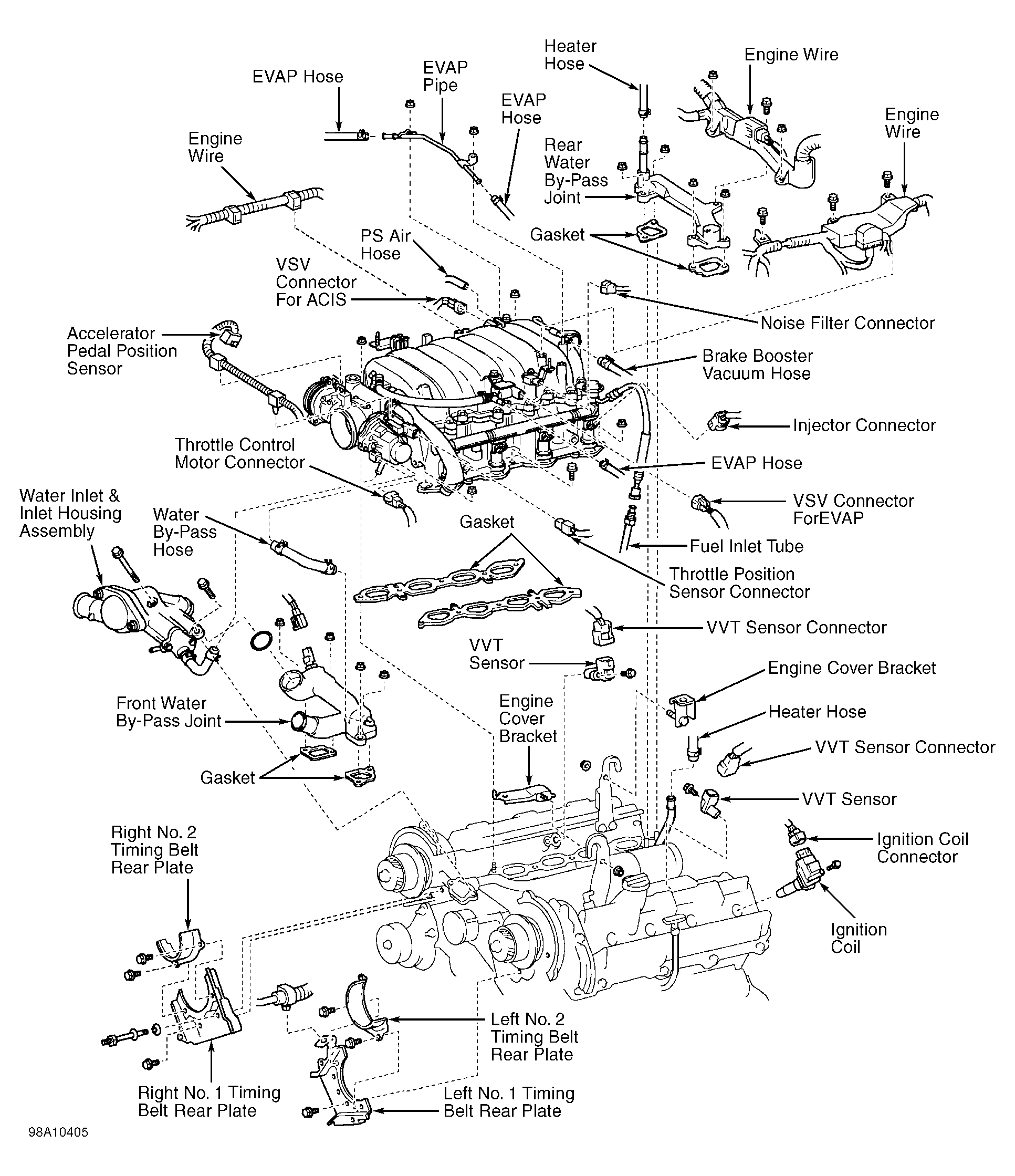 - Disconnect EVAP and ACIS vacuum switching valve connectors. Disconnect injector connectors. Disconnect noise filter connector. See Figure. Disconnect brake booster vacuum hose from union on intake manifold. Disconnect PCV hose. Disconnect EVAP and EVAP vacuum switching valve hoses. Disconnect PS air hose from intake manifold.