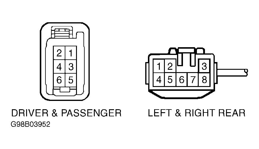 Disconnect window motor connector. Connect ohmmeter positive lead to window motor connector terminal No. 4 and negative ohmmeter lead to window motor connector terminal No. 5. Apply battery positive lead to motor connector terminal No. 1 and battery negative lead to motor connector terminal No. 2. See Figure. Continuity should exist when window goes up. Continuity should not exist when window is fully closed. If continuity is not as specified, replace window motor assembly.