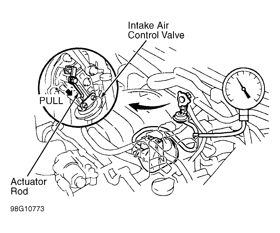 2. Connect a vacuum gauge to vacuum "T" fitting. Start engine. With engine idling, ensure vacuum reading is about 11.8 in. Hg, and IACV actuator rod is pulled out. See Figure. If vacuum is not as specified or actuator valve rod fails to pull out, go to next step.