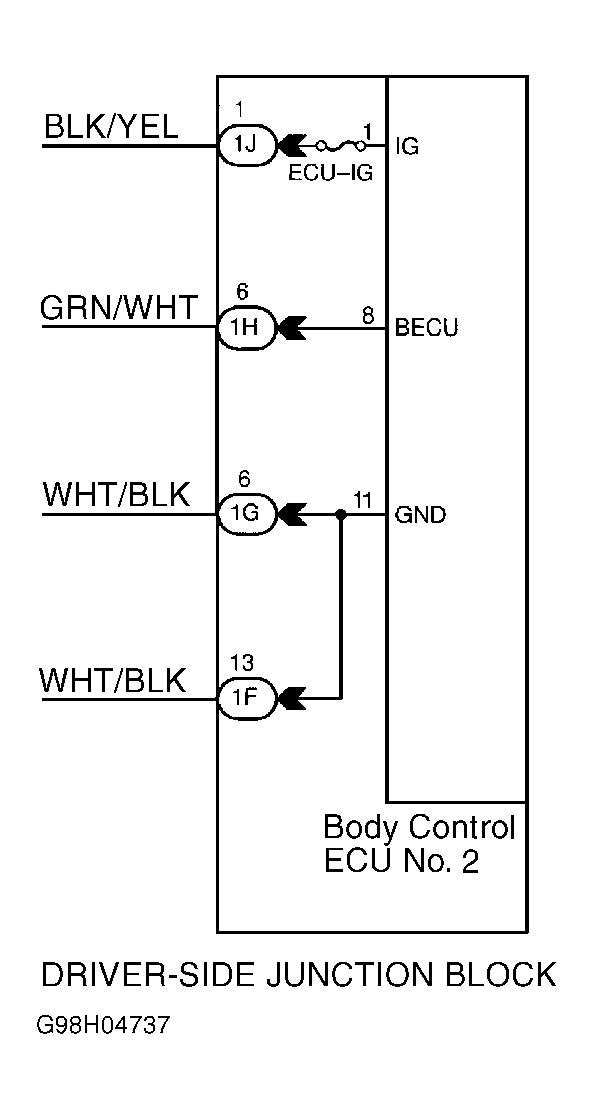 Turn ignition on. Using a voltmeter, check voltage between Black/Yellow wire (IG) and White/Black wire (GND) leading into junction block. See Fig 1. Check voltage between Green/White wire (BECU) and White/Black wire (GND) leading into junction block. If voltages are not 10-14 volts, go to next step. If voltages are 10-14 volts, go to next test listed in appropriate TROUBLE SHOOTING SYMPTOMS table. - Check Circuits