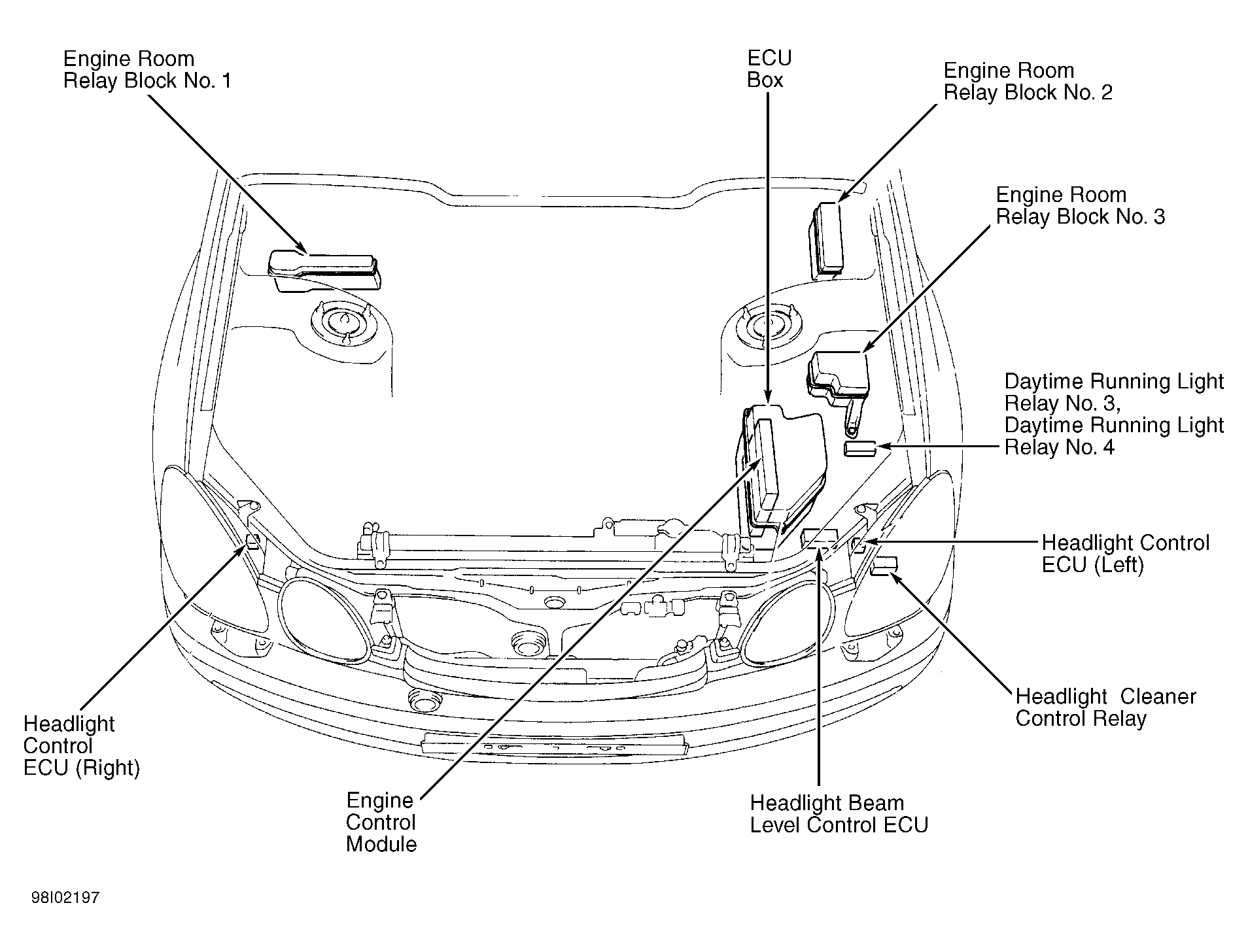| Engine Room Relay Block No. 2 | On left side of engine compartment, behind strut tower. See Figure. |