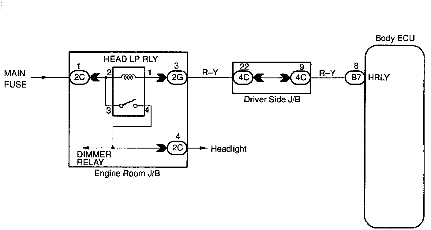 Head light relay will be "ON" by operating the headlight switch. The transistor which activates the taillight relay has two sorts: one activates directly by the headlight switch for fail sate and the other activates by CPU. the one that activates by CPU has two systems and prevents the headlight from turning off at the time of one system trouble in the automatic operation circuit.