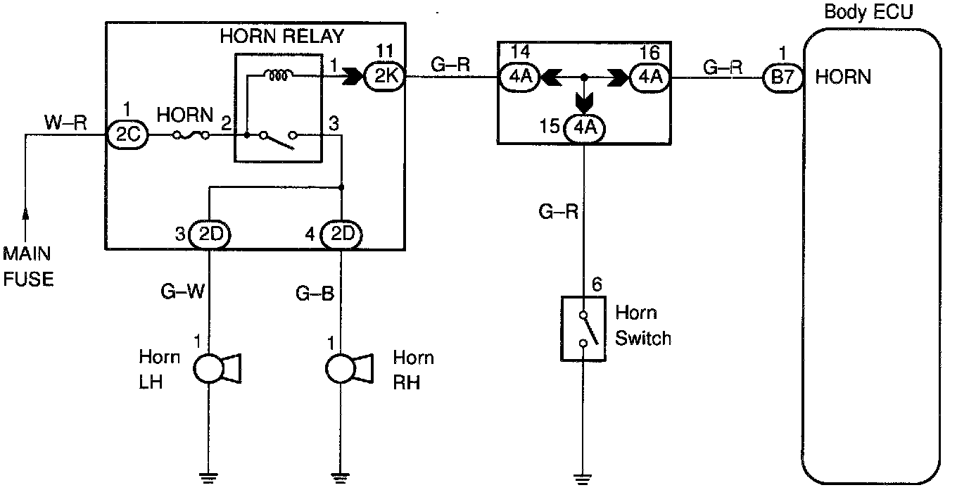 The horn is connected to the Body ECU and activated by the Body ECU during warning of the theft deterrent system.
