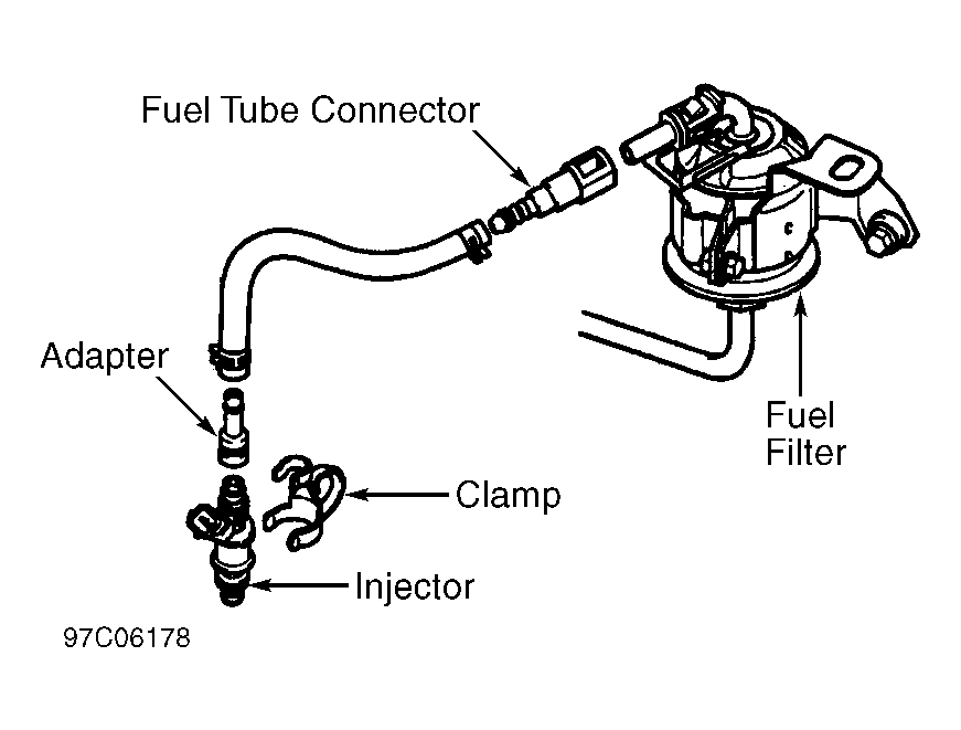 1. On ES300, remove fuel injector. See REMOVE/INSTALL/OVERHAUL article. Connect Fuel Tube Adapter (23801-20040) to fuel filter outlet side. Ensure fuel injector "O" ring is installed. Install Injection Measuring Tool Set (09268-41046). See Fig 1 or Fig 2. Install injector retainer clip. Attach a piece of vinyl tubing to bottom of fuel injector to prevent fuel splash. Put vinyl tubing into a graduated measuring cylinder. Go to step 4).