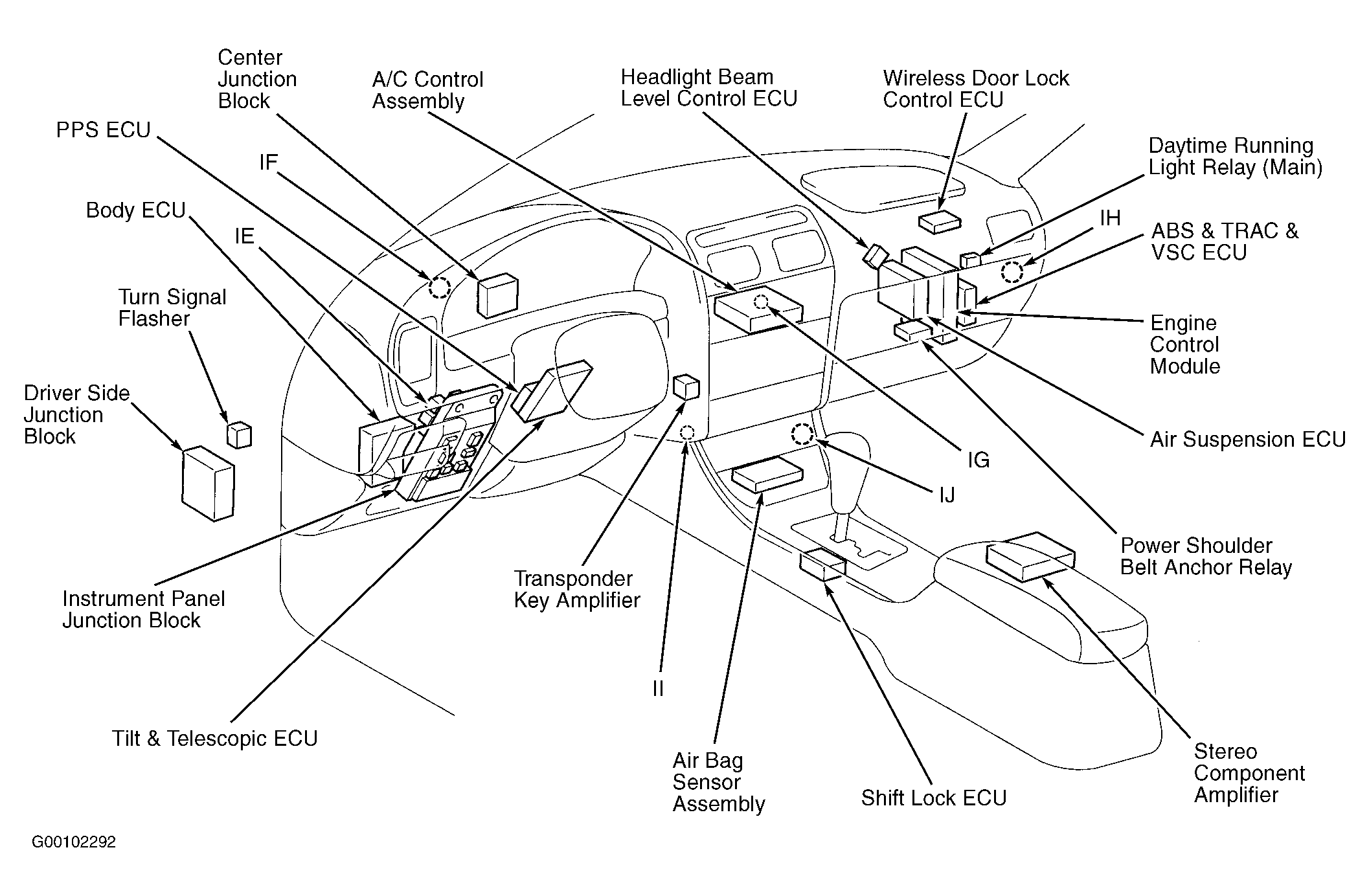| AB, TRAC & VSC ECU | Behind right side of dash. See Figure. |