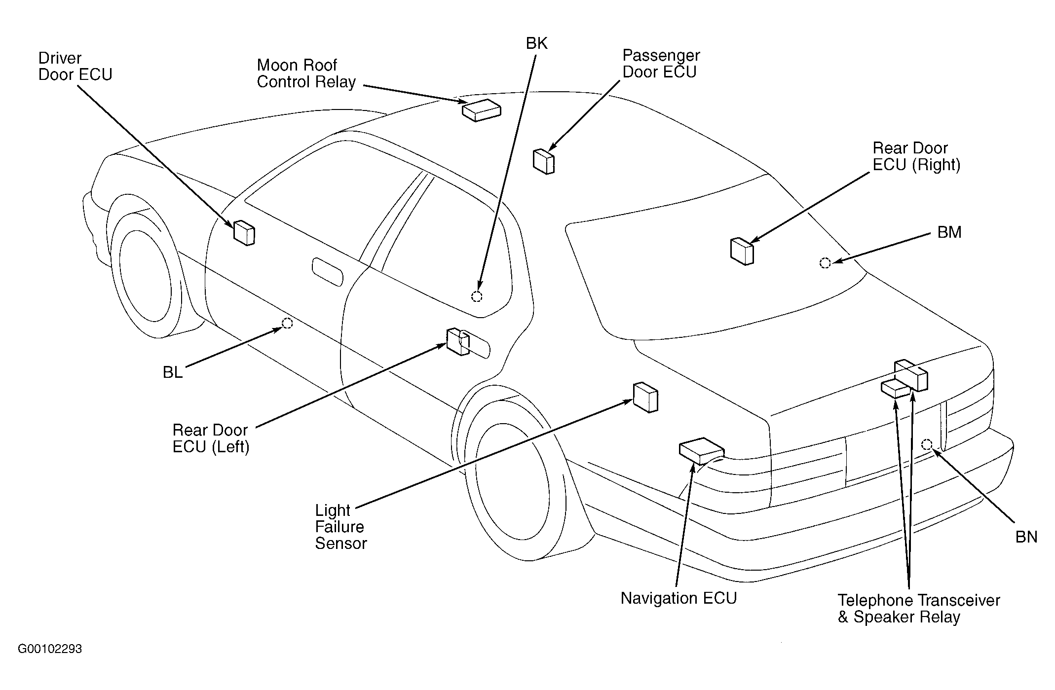 | Navigation ECU | At left rear corner of luggage compartment. See Figure. |