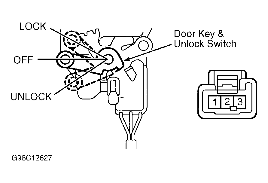 Procedure applies only to door key lock and unlock switch on driver's and passenger's doors. For testing of rear (luggage compartment) door key lock and unlock switch, see REAR (LUGGAGE COMPARTMENT) DOOR KEY LOCK & UNLOCK SWITCH .