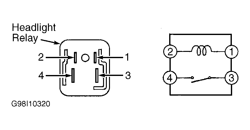 - Using ohmmeter, check that continuity exists between terminals No. 1 and 2 on headlight relay. Apply battery voltage and ground to terminals No. 1 and 2 on headlight relay. Using ohmmeter, check that continuity exists between terminals No. 3 and 4 on headlight relay. Replace headlight relay if defective.