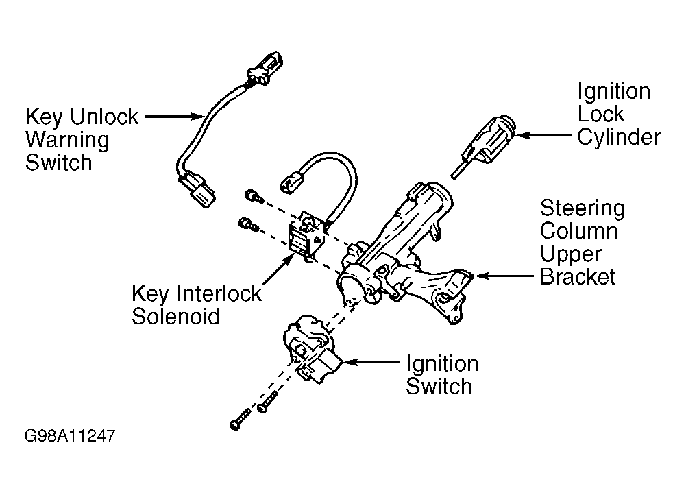 - Connect ohmmeter between electrical terminals on key unlock warning switch. Check that no continuity exists with ignition key removed from ignition lock cylinder. Check that continuity exists with ignition key installed in ignition lock cylinder. Replace key unlock warning switch if defective.