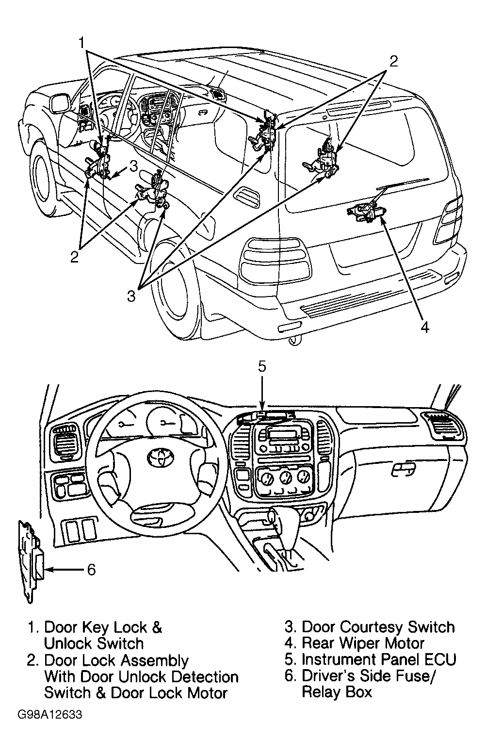 Check for defective connectors and wiring between door courtesy switch and instrument panel Electronic Control Unit (ECU). See WIRING DIAGRAMS . Instrument panel ECU is located behind center of instrument panel and contains a 14-pin, 18-pin and 22-pin electrical connector. See Figure.