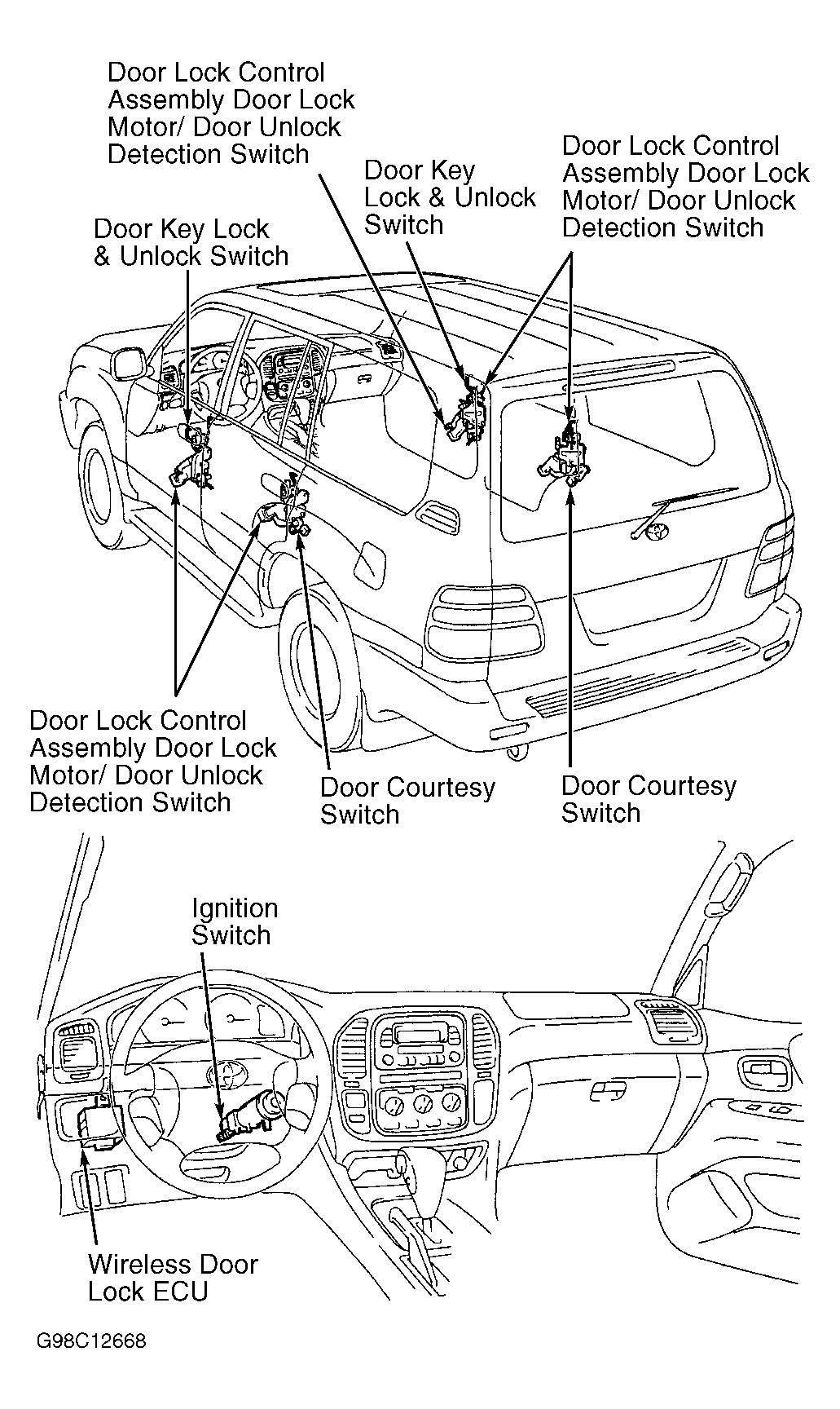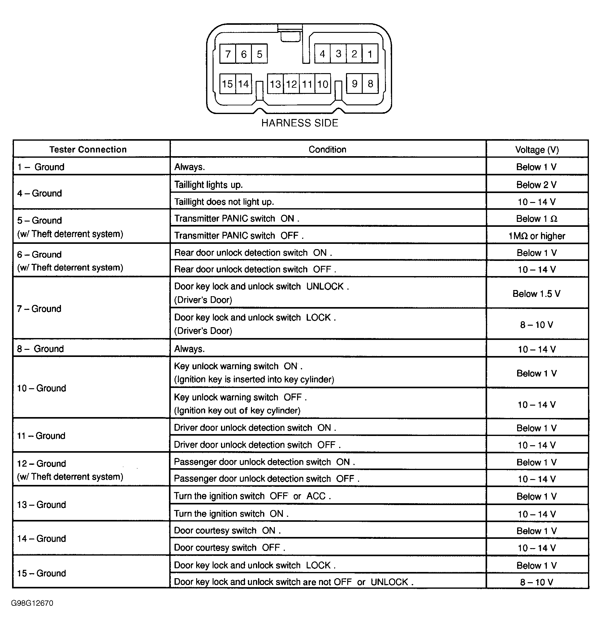 With ignition switch in OFF position, remove wireless door lock ECU from under left side of instrument panel. See Figure. Measure voltage (backprobe) between ground and ECU connector terminal No. 10 (Red/Black wire). See Figure. Battery voltage should exist. If battery voltage does not exist, repair Red/Black wire. If battery voltage exists, proceed to next test given in TROUBLE SHOOTING SYMPTOMS under TROUBLE SHOOTING.