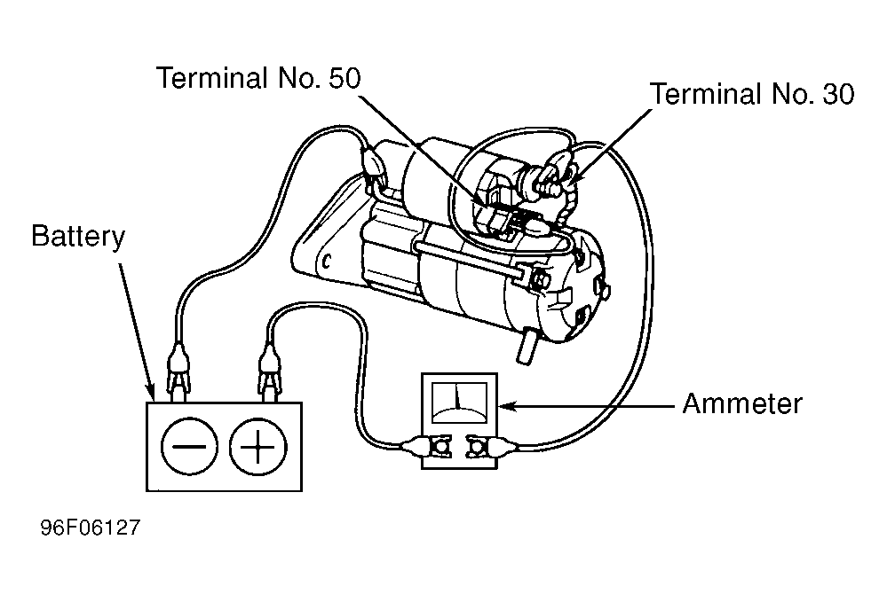 - Remove starter. Connect ammeter in series between starter motor terminal No. 30 (battery terminal) and a fully charged 12-volt battery. Connect battery negative to starter case ground. See Fig 1, Fig 2 or Fig 3 . Connect voltmeter to battery to observe voltage draw readings.