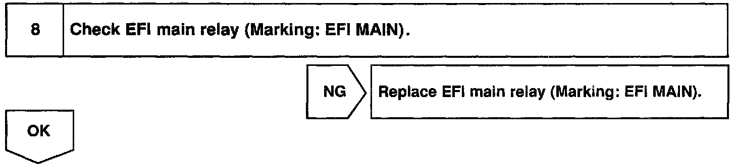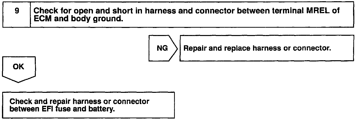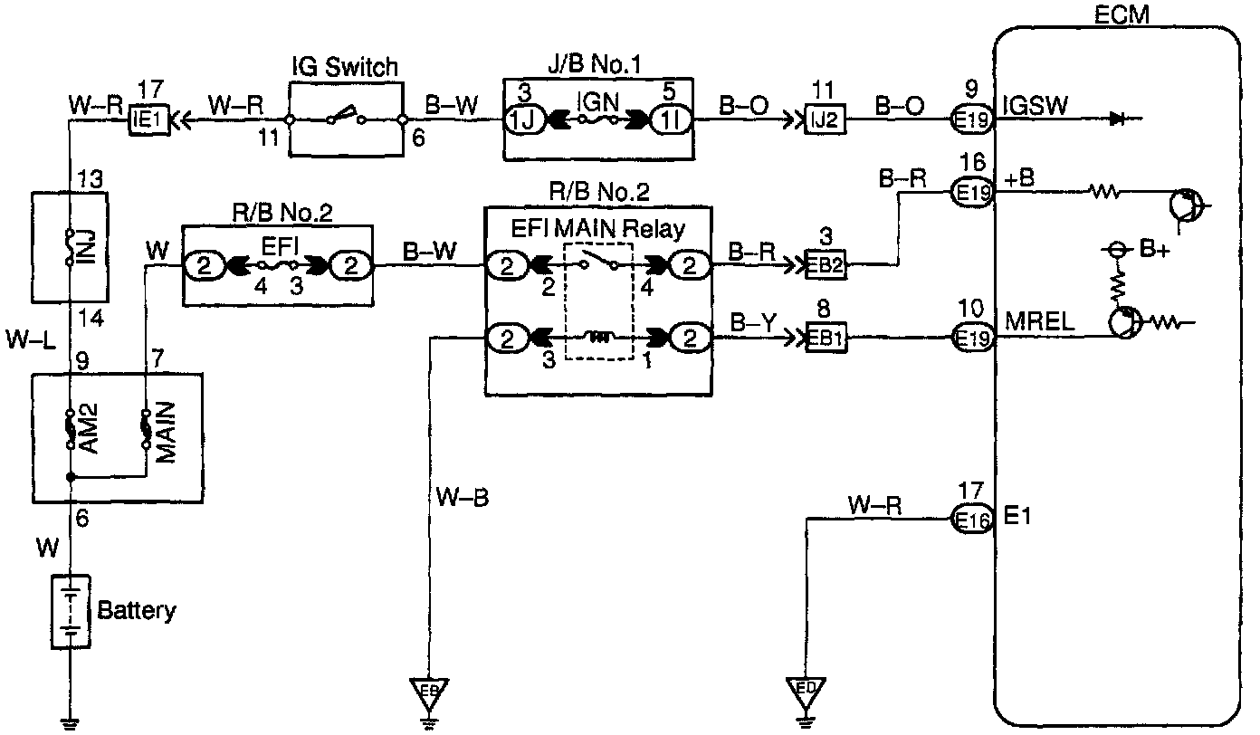 When the ignition switch is turned ON, battery positive voltage is applied to the terminal IGSW of the ECM and the EFI main relay (Making: EFI MAIN) control circuit in the ECM sends a signal to the terminal MREL of the ECM switching on the EFI main relay.
