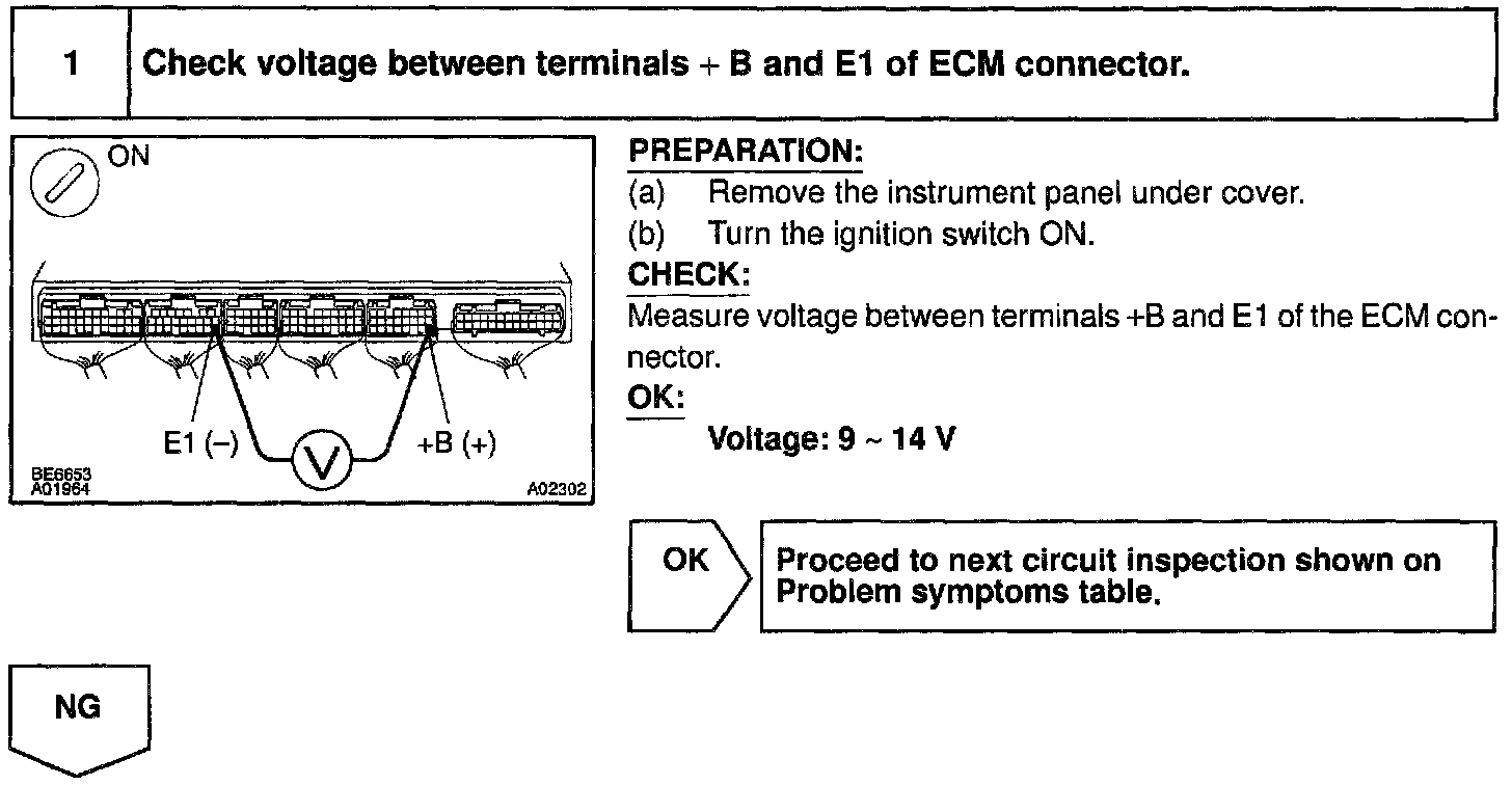 This signal causes current to flow to the coil, closing the contacts of the EFI main relay and supplying power to the terminals +B of the ECM.