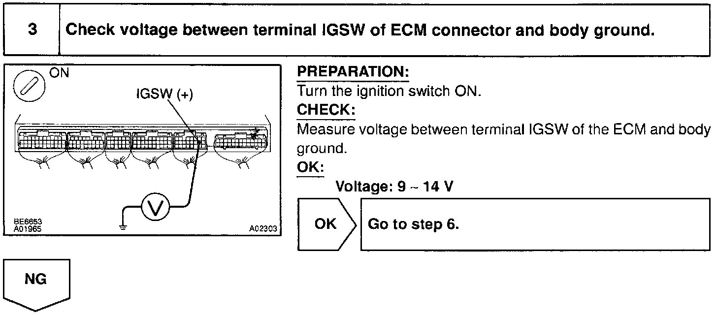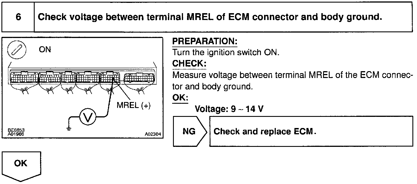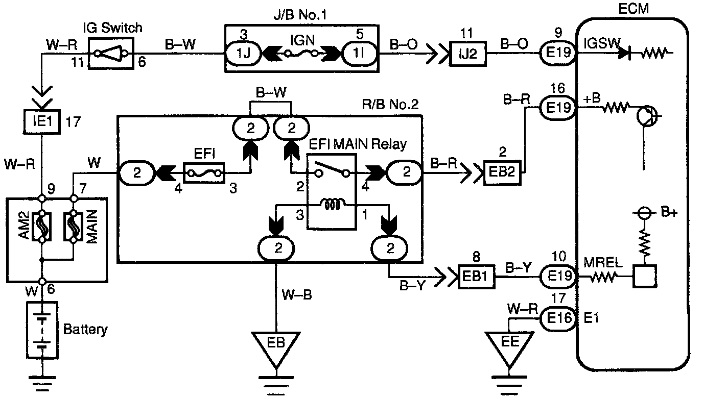 This signal causes current to flow to the coil, closing the contacts of the EFI main relay and supplying power to the terminals +B of the ECM.