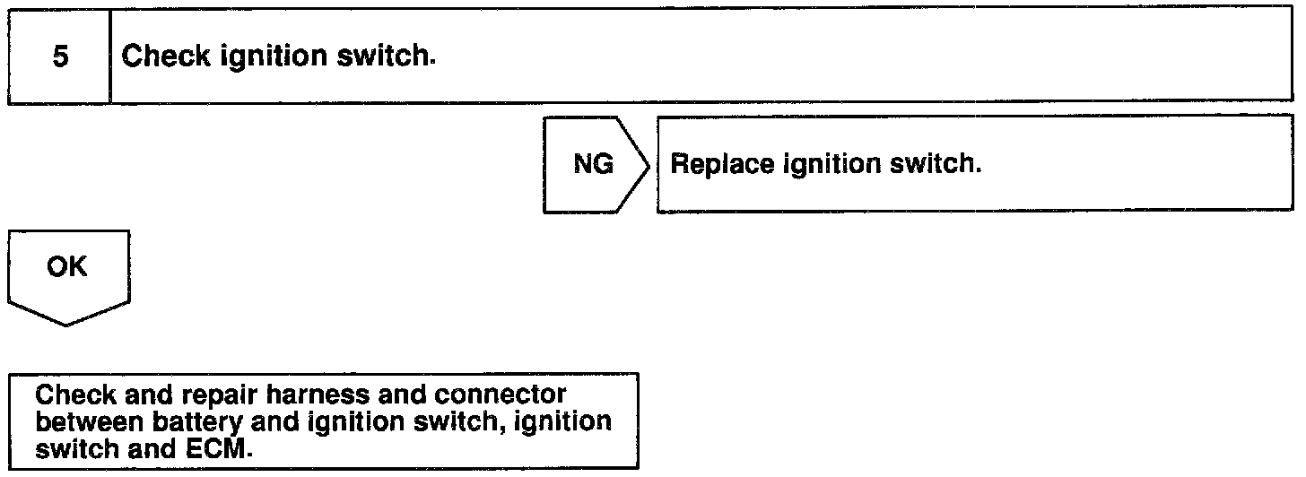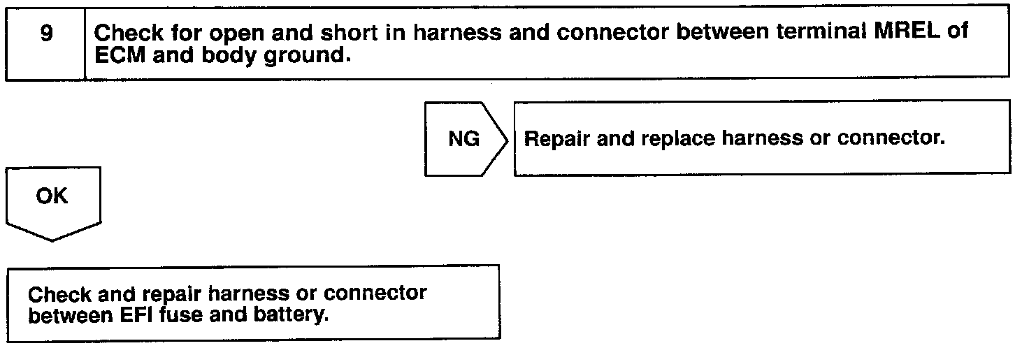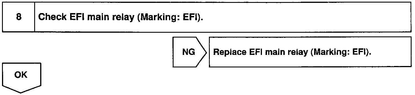 When the ignition switch is turned ON, battery positive voltage is applied to the terminal IGSW of the ECM and the EFI main relay (Making: EFI) control circuit in the ECM sends a signal to the terminal MREL of the ECM switching on the EFI main relay.