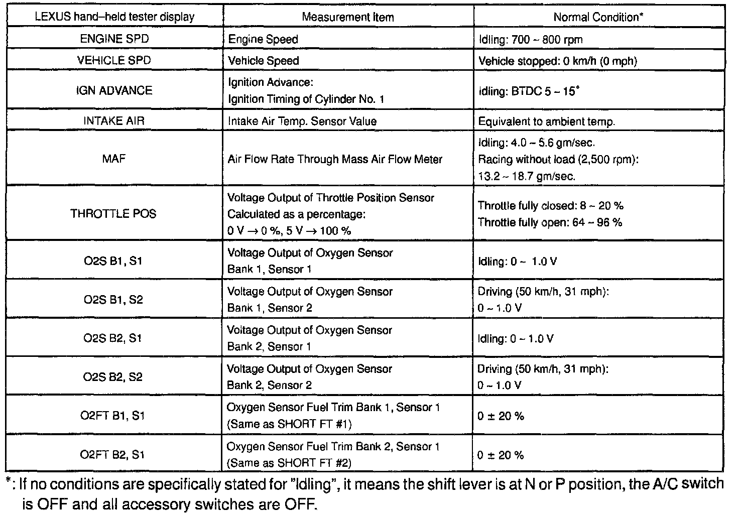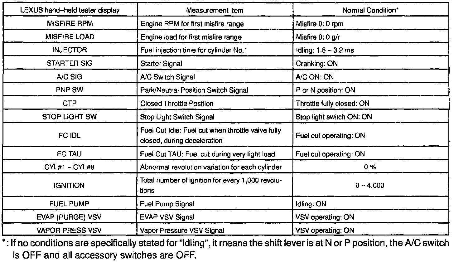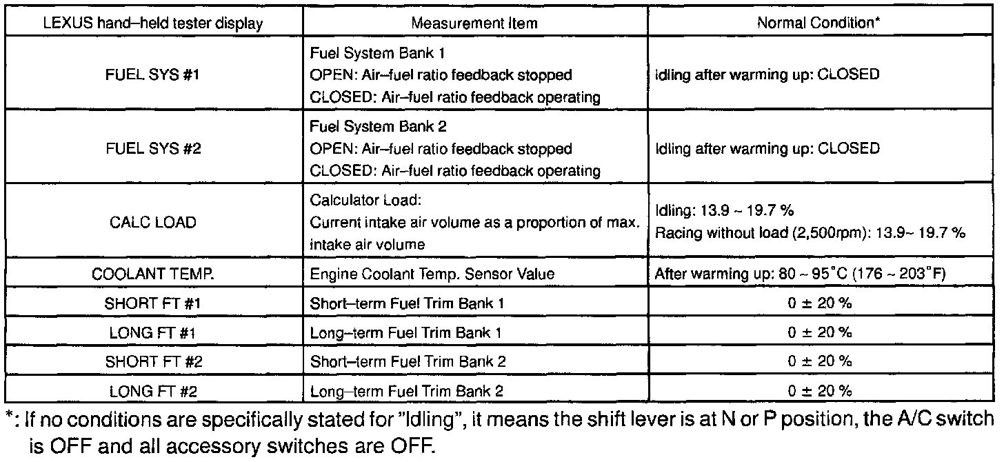 NOTICE: The values given below for "Normal Condition" are representative values, so a vehicle may still be normal even if its value varies from those listed here. So do not decide whether a part is faulty or not solely according to the "Normal Condition" here.