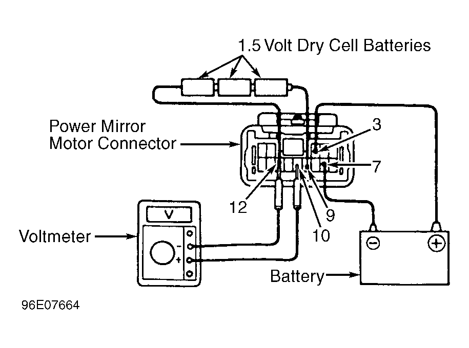 - Disconnect power mirror motor harness connector. Connect three 1.5-volt dry cell batteries together in series. See Fig 1. Connect dry cell positive lead to terminal No. 7 and negative lead to terminal No. 6. Connect positive lead of voltmeter to terminal No. 13 and negative lead to terminal No. 6.