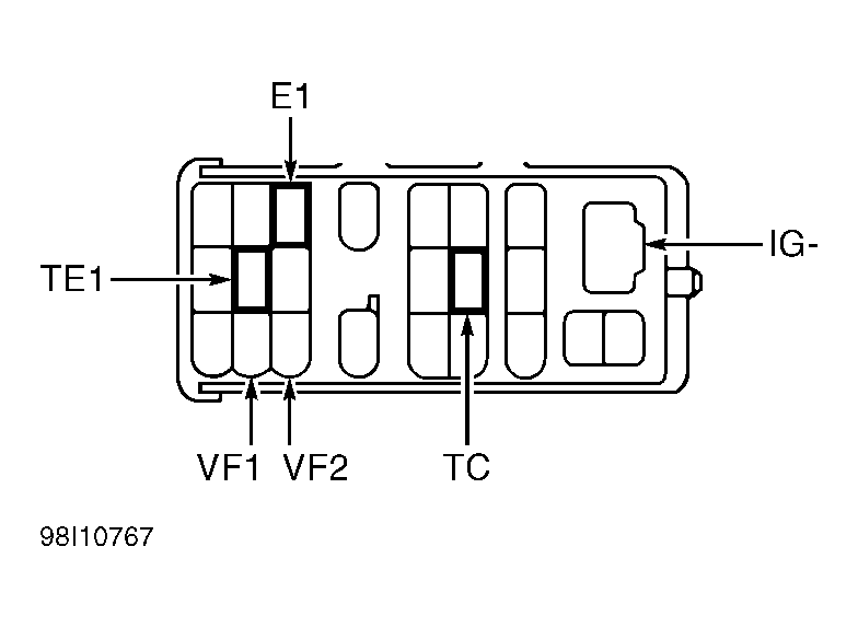 4. Install Jumper Wire (SST 09843-18020) between terminals TC and E1 of DLC No. 1. See Figure. Connector is located near air intake chamber. Check base timing. See IGNITION TIMING  table.