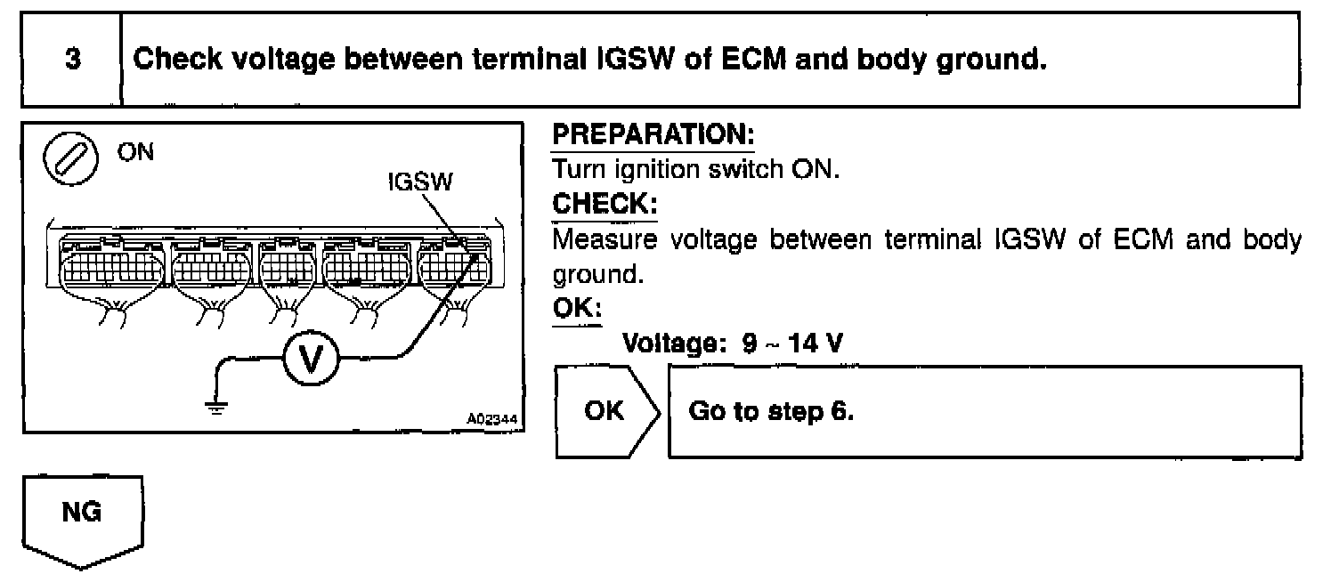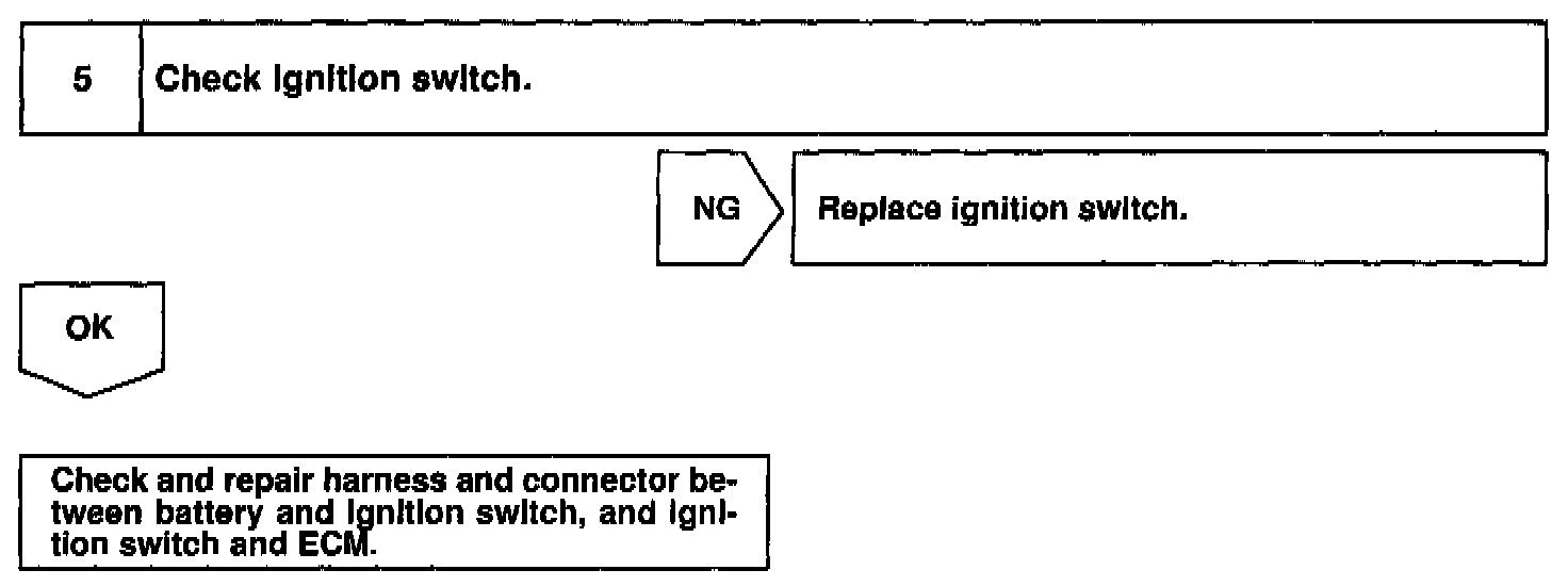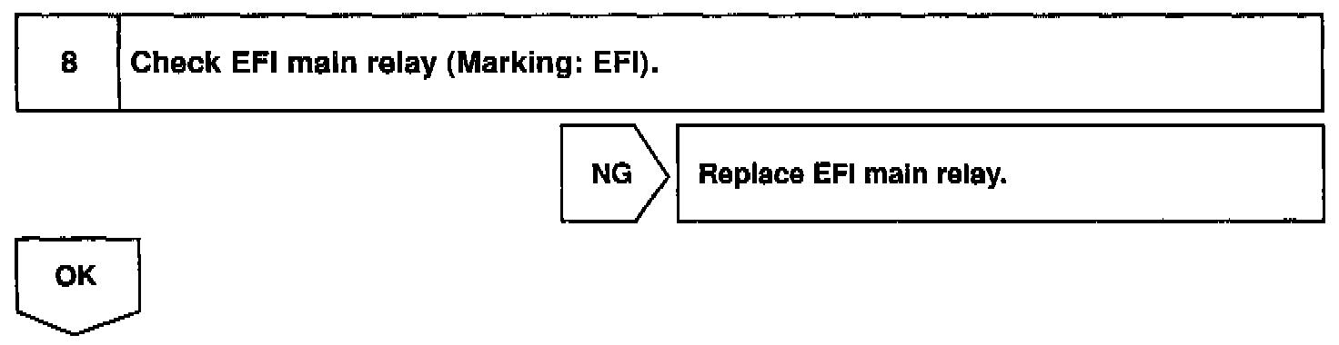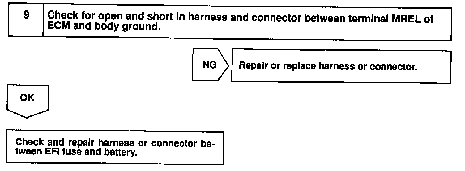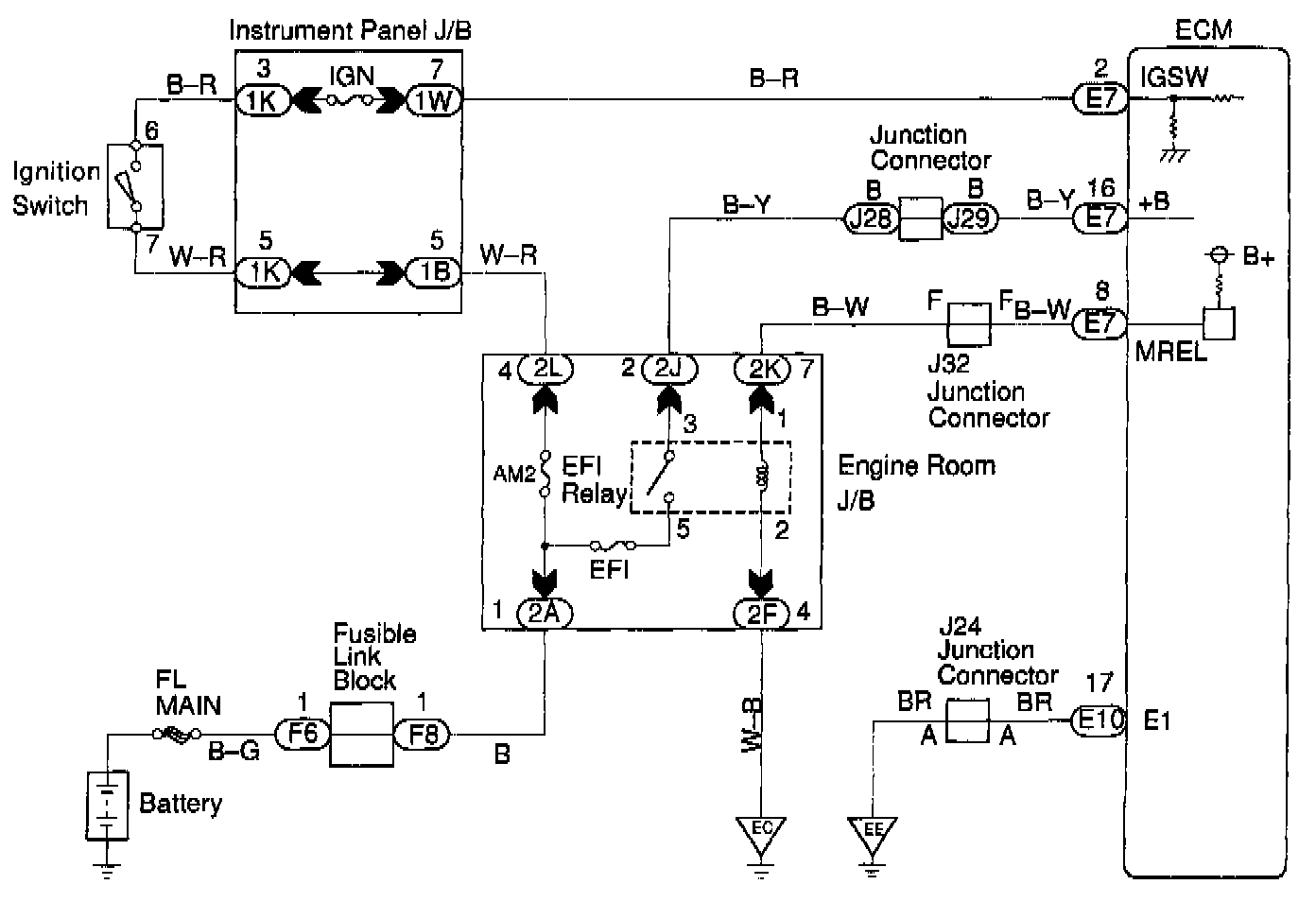 When the ignition switch is turned ON, battery positive voltage is applied to terminal IGSW of the ECM and the EFI main relay (Marking: EFI) control circuit in the ECM sends a signal to terminal MREL of the ECM switching on the EFI main relay.