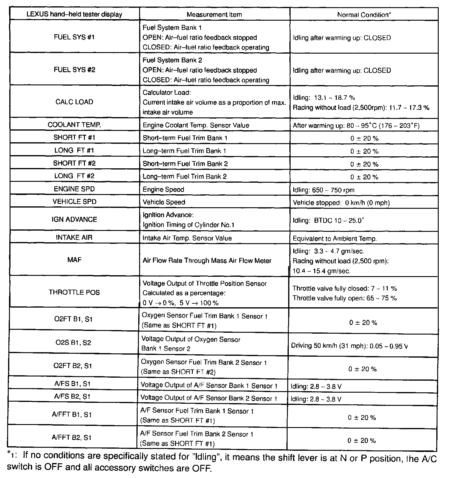 ENGINE OPERATING CONDITIONNOTE: The values given for "Normal Condition" are representative values, so a vehicle may still be normal even if its value varies from those listed here. So do not decide whether a part is faulty or not solely according to the "Normal Condition" here.