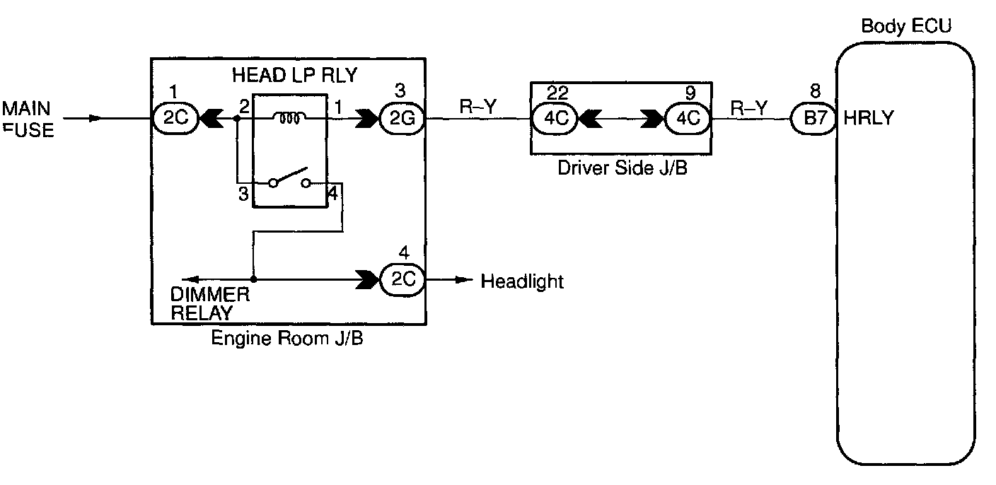 CIRCUIT DESCRIPTIONHead light relay will be "ON" by operating the headlight switch. The transistor which activates the taillight relay has two sorts: one activates directly by the headlight switch for fail safe and the other activates by CPU. the one that activates by CPU has two Systems and prevents the headlight from turning off at the time of one system trouble in the automatic operation circuit.