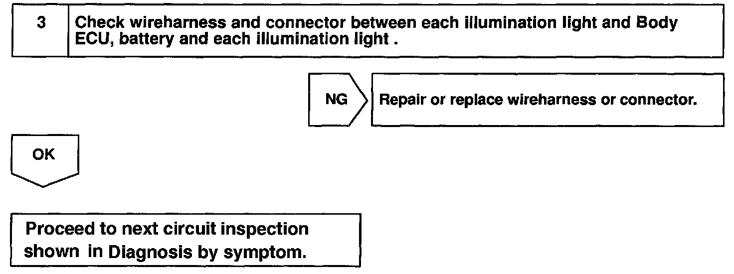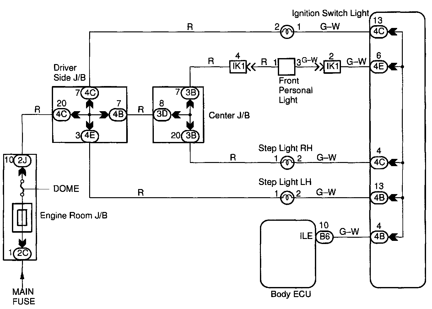 CIRCUIT DESCRIPTIONReceiving the courtesy signal from either of the door ECU, the Body ECU will make the interior light, ignition light, and foot light come on.