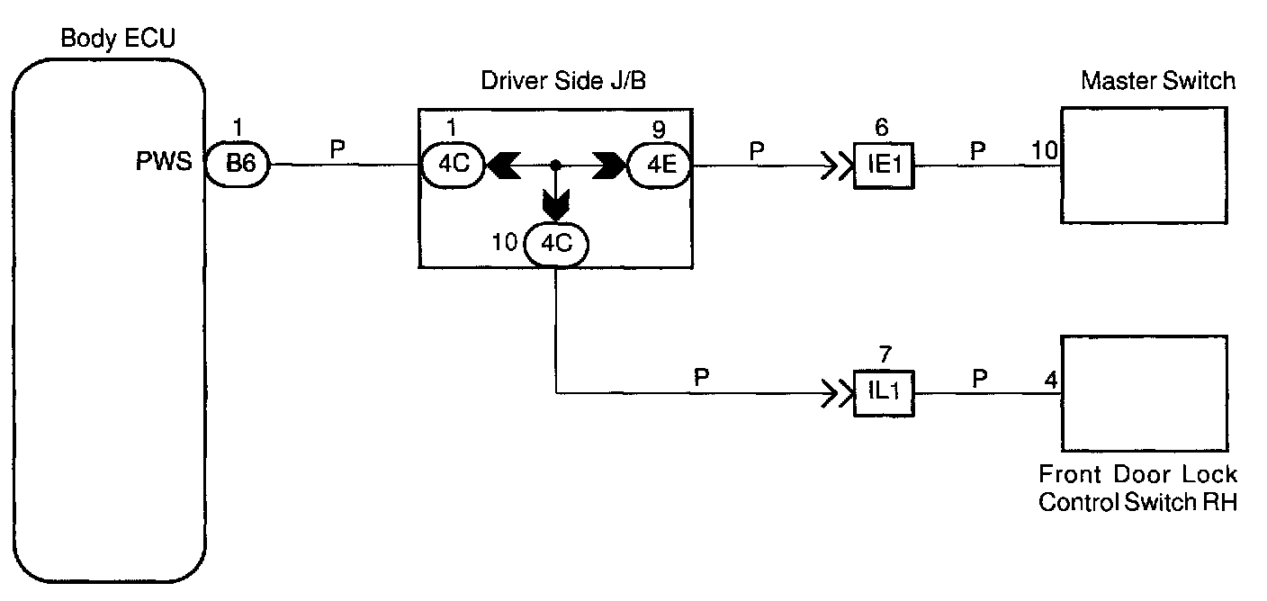 This circuit is the power source of the master switch for the driver's door and the door lock switch for the passenger's doors.