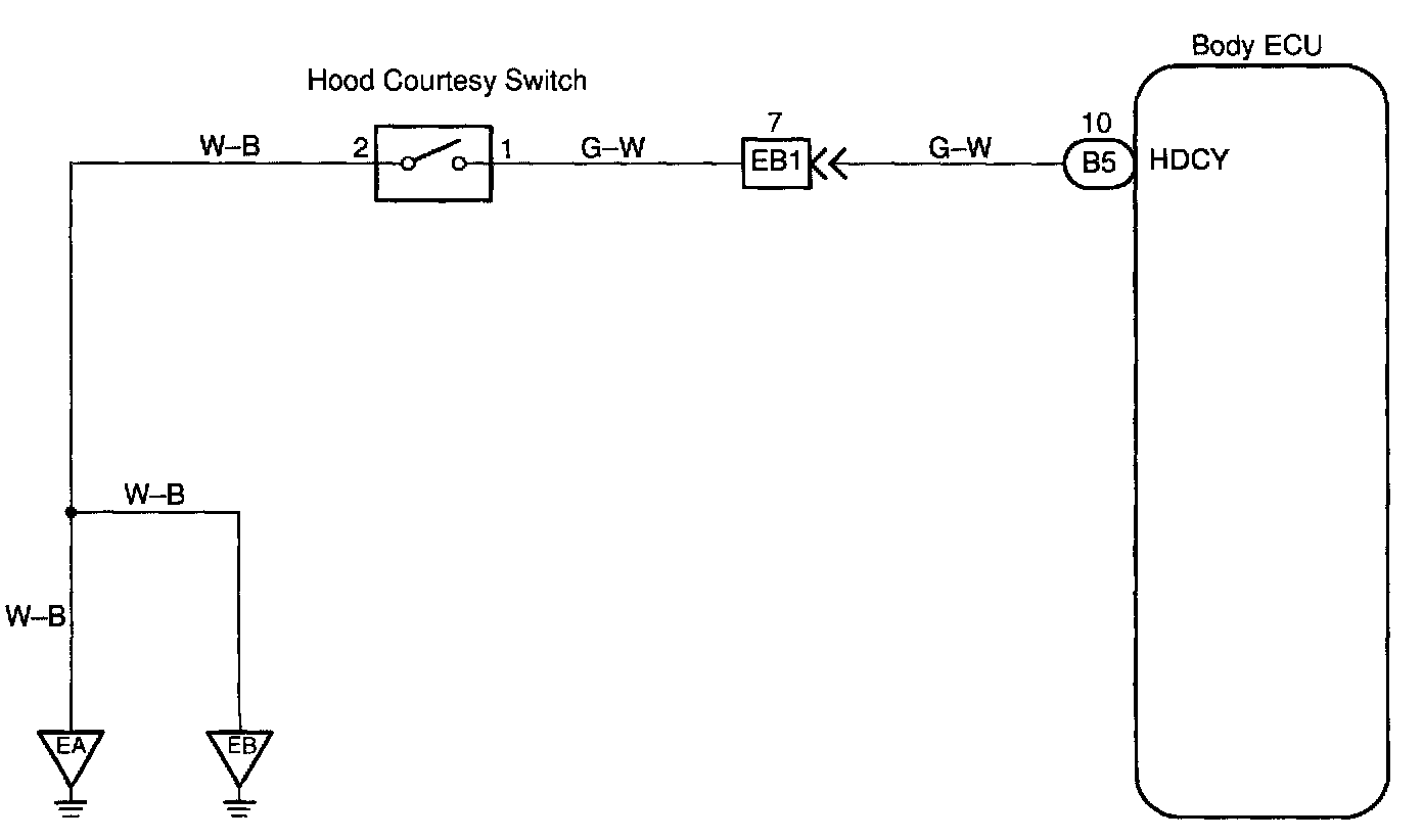 CIRCUIT DESCRIPTIONThe hood courtesy switch is built into the engine hood lock assembly and goes on when the engine hood is opened and goes off when the engine hood is closed.