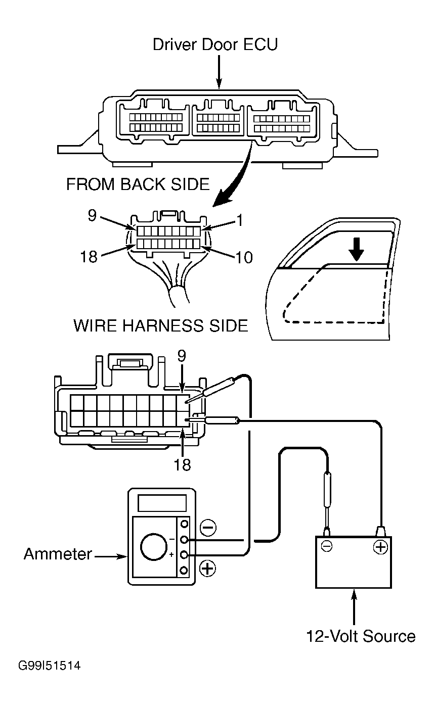 - Disconnect driver door ECU harness connector. Using an ammeter, connect positive lead to terminal No. 9 of harness connector, and negative lead to negative terminal of battery. See Fig 1. Using a jumper wire, connect battery positive to terminal No. 18 at harness connector.