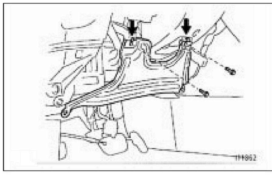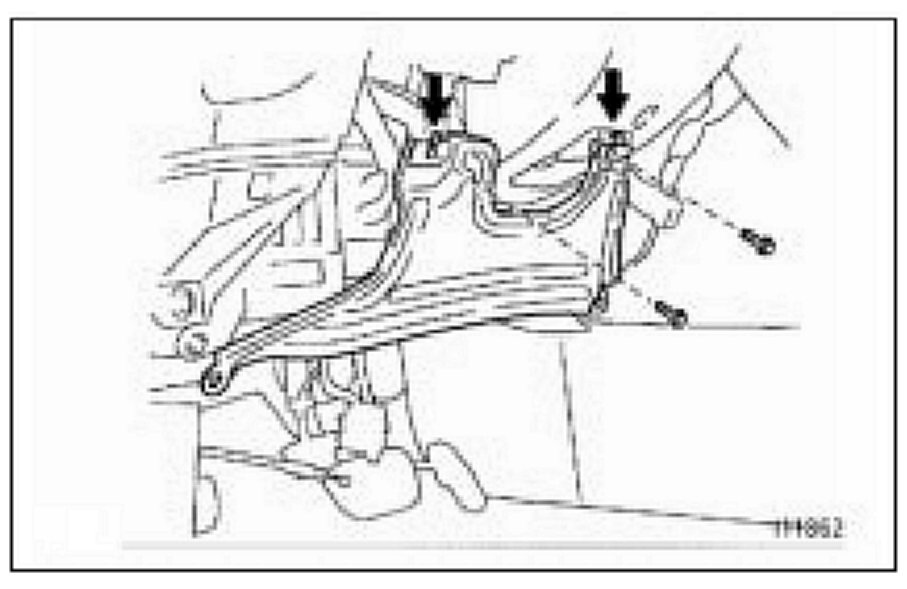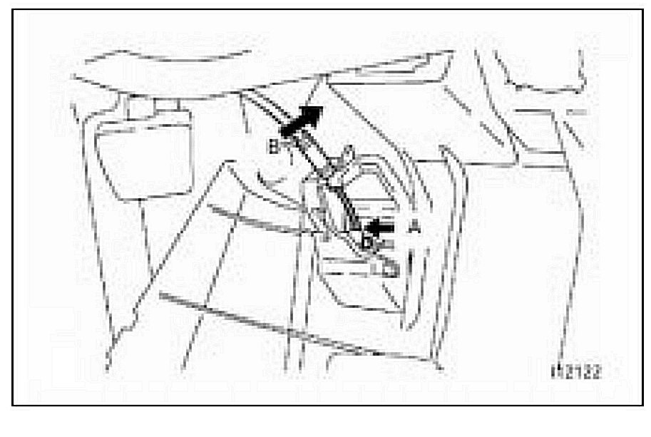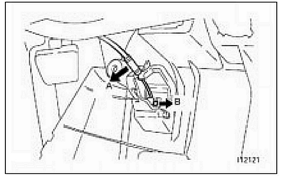 (i) Disengage the clamped portion of the hood lock control cable, then remove the rear end of the hood lock control cable from the hood lock release lever in order A, B as shown in the illustration.