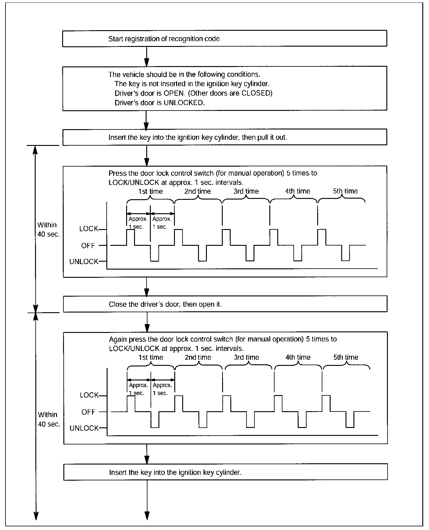 Using the information below, and charts shown, register the key transmitter recognition code for the wireless door lock control receiver. Read the entire procedure before attempting to register a key transmitter.