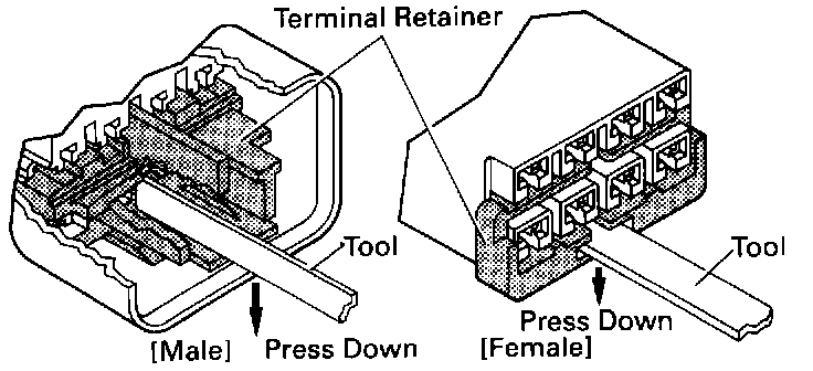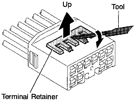 HINT: To remove the terminal from the connector, please construct and use the special tool or like object shown on the left.
