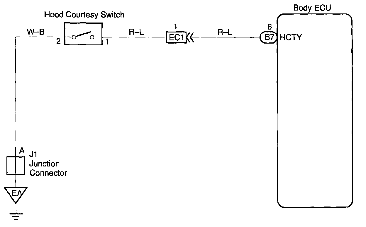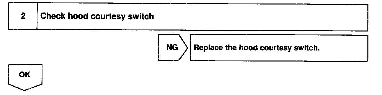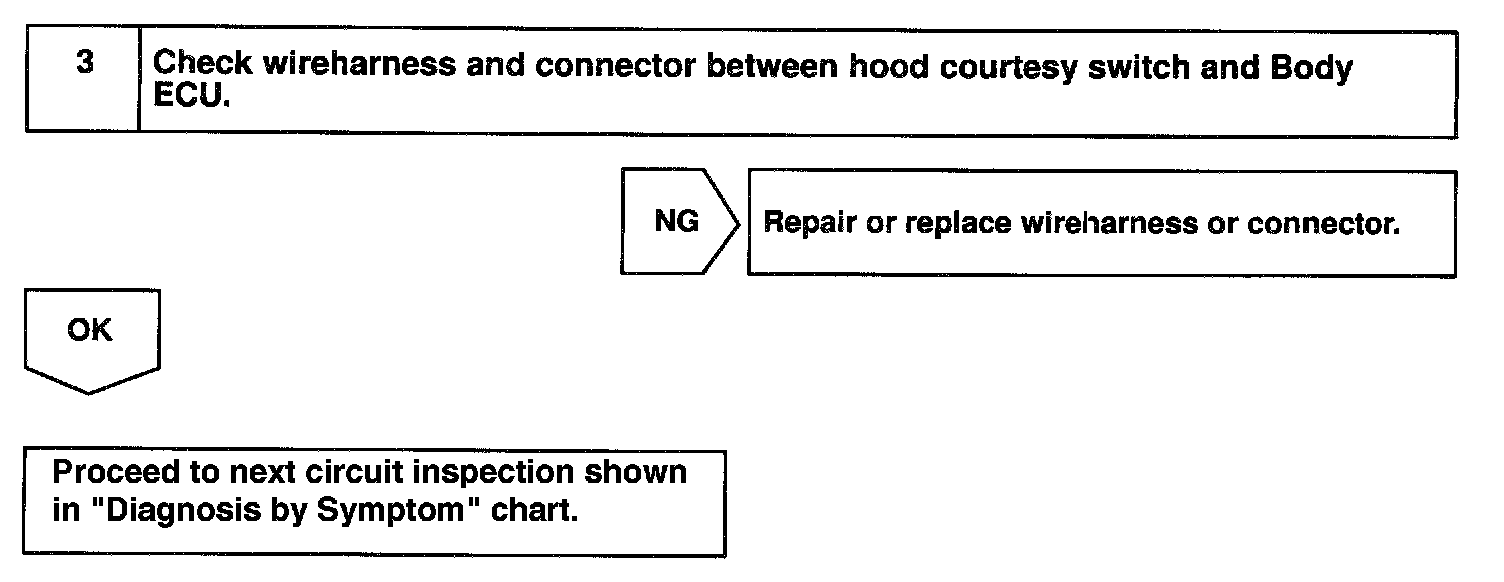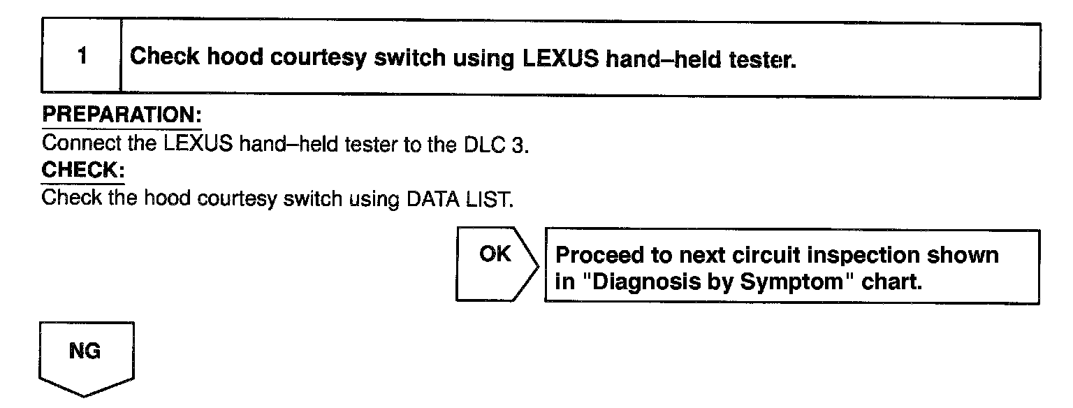 Home >> Lexus >> 1999 >> RX 300 FWD V6-3.0L (1MZ-FE) >> Repair and Diagnosis >> Relays and Modules >> Relays and Modules - Powertrain Management >> Relays and Modules - Computers and Control Systems >> Body Control Module >> Testing and Inspection >> Component Tests and General Diagnostics >> Hood Courtesy Switch Circuit