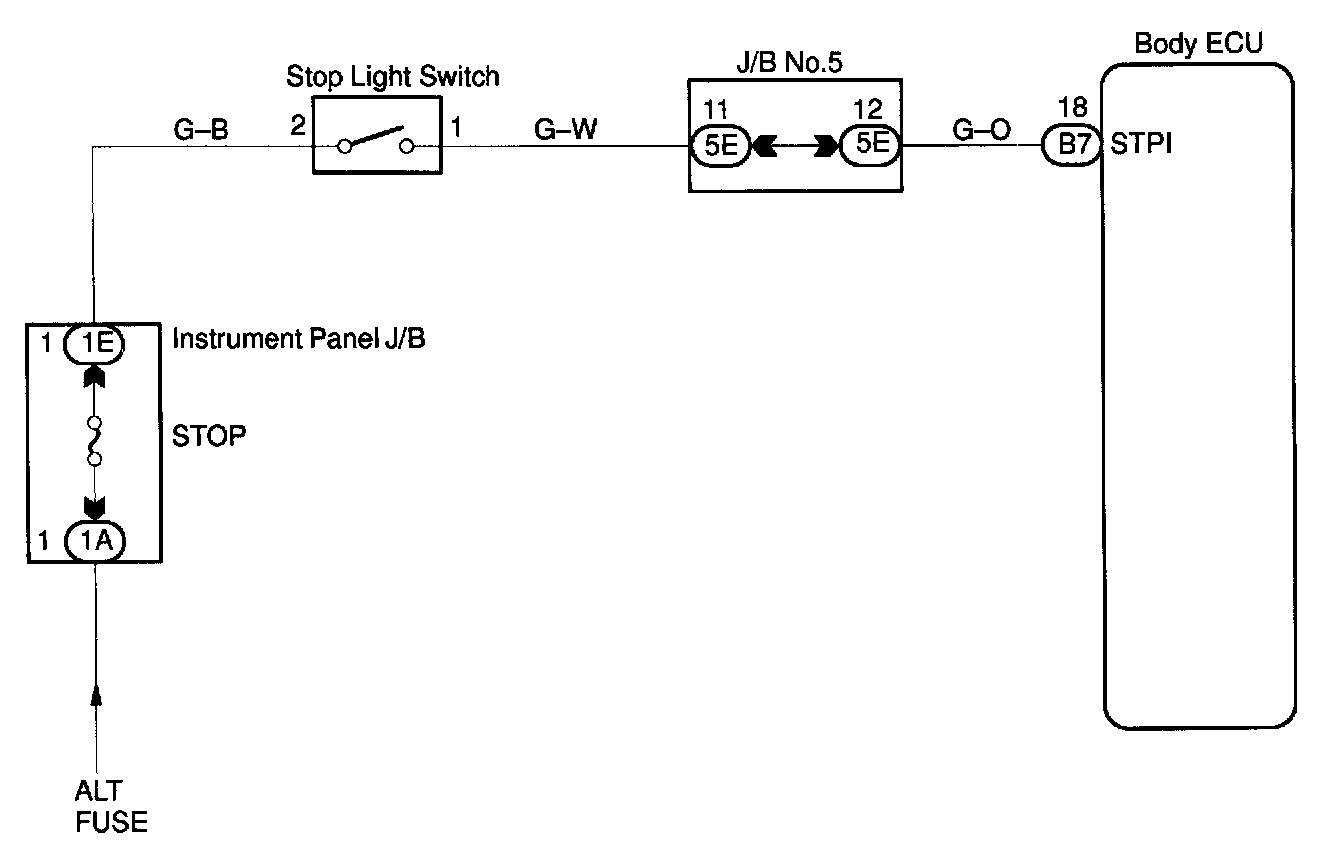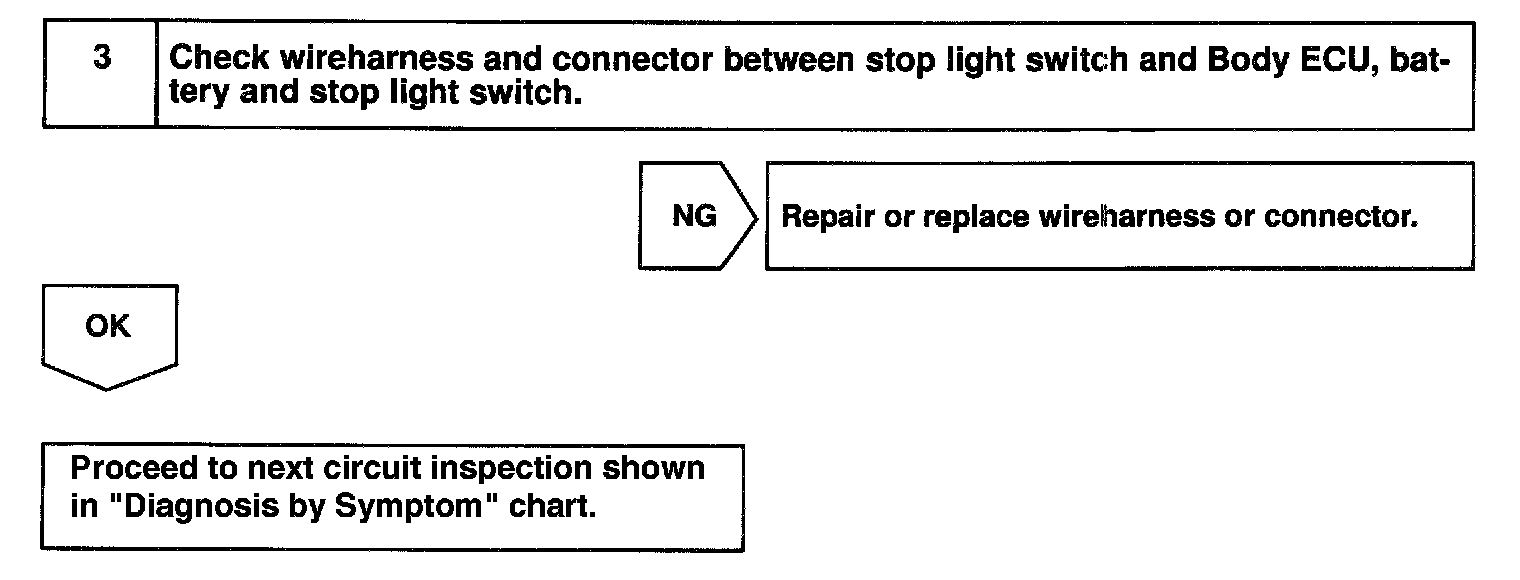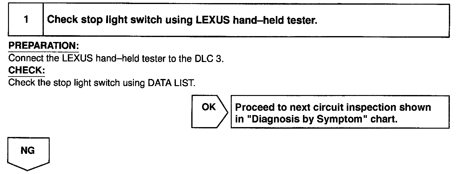 Home >> Lexus >> 1999 >> RX 300 FWD V6-3.0L (1MZ-FE) >> Repair and Diagnosis >> Relays and Modules >> Relays and Modules - Powertrain Management >> Relays and Modules - Computers and Control Systems >> Body Control Module >> Testing and Inspection >> Component Tests and General Diagnostics >> Stop Light Switch Circuit