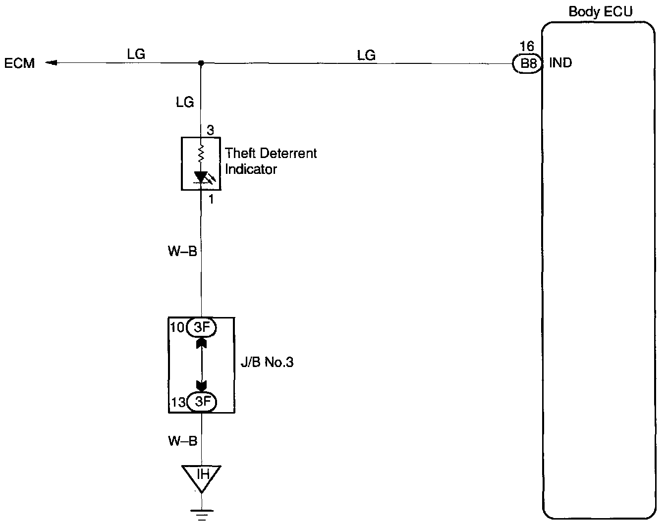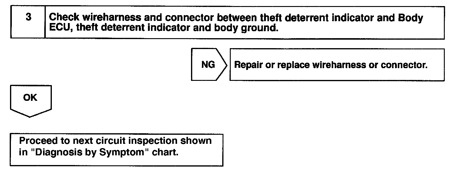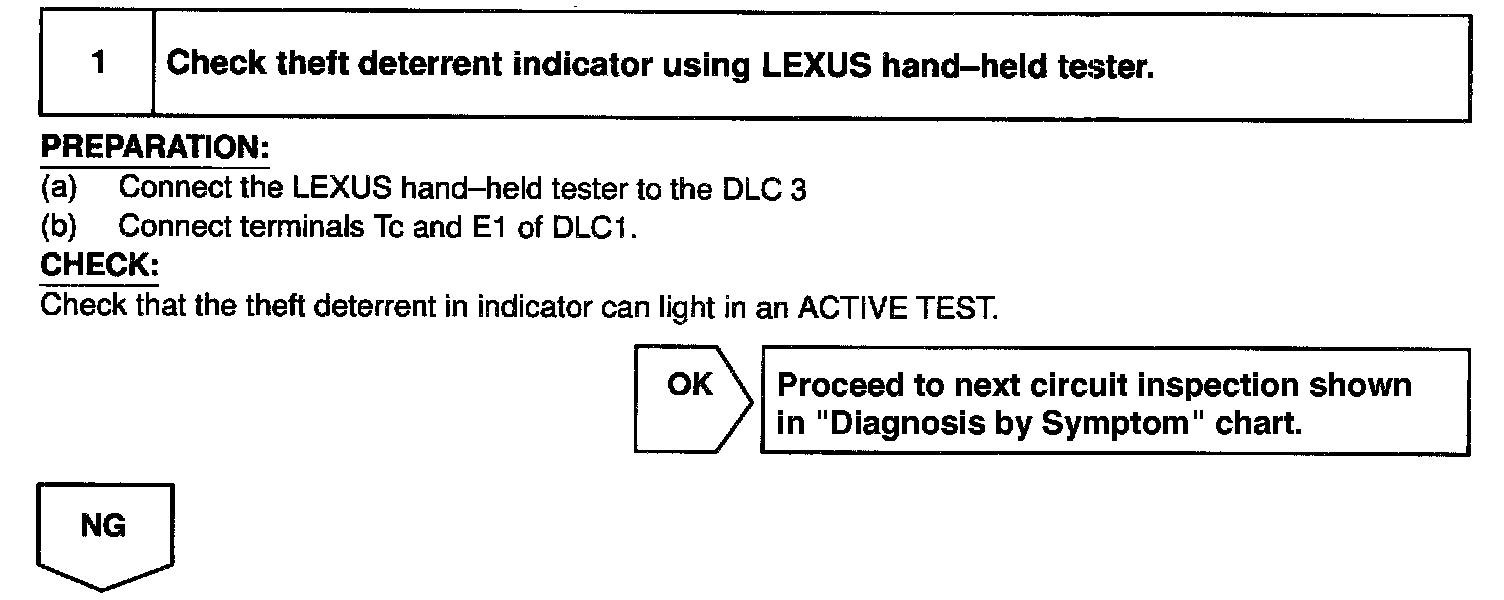 Home >> Lexus >> 1999 >> RX 300 FWD V6-3.0L (1MZ-FE) >> Repair and Diagnosis >> Relays and Modules >> Relays and Modules - Powertrain Management >> Relays and Modules - Computers and Control Systems >> Body Control Module >> Testing and Inspection >> Component Tests and General Diagnostics >> Theft Deterrent Indicator Circuit