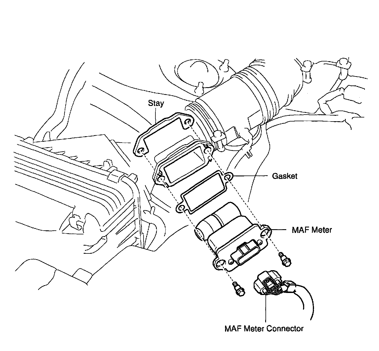 b. Install the MAF meter with the 2 bolts and stay.