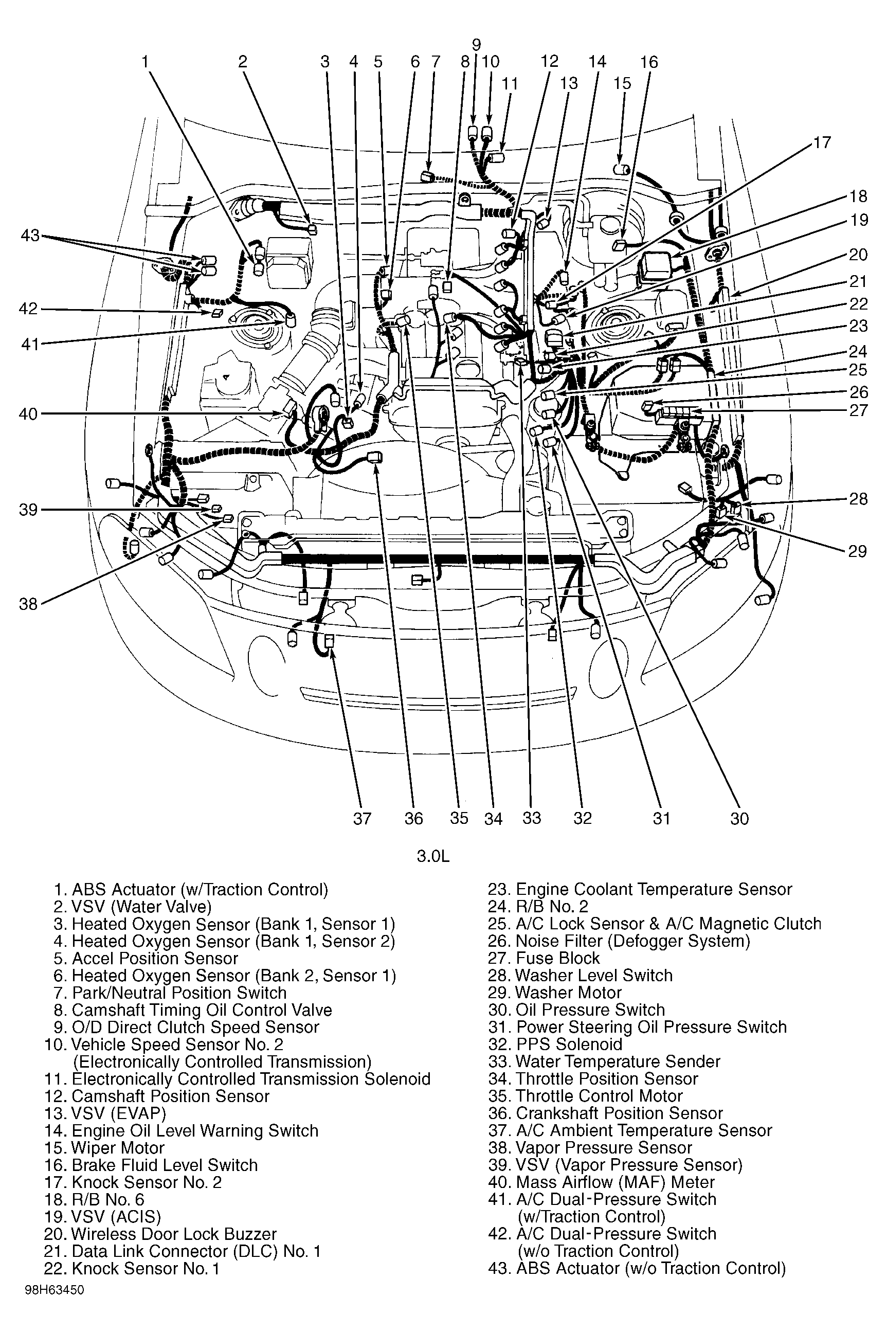 R/B No. 2 (3.0L) On left side of engine compartment, behind battery. See Figure.