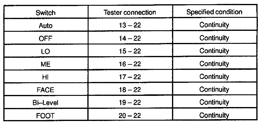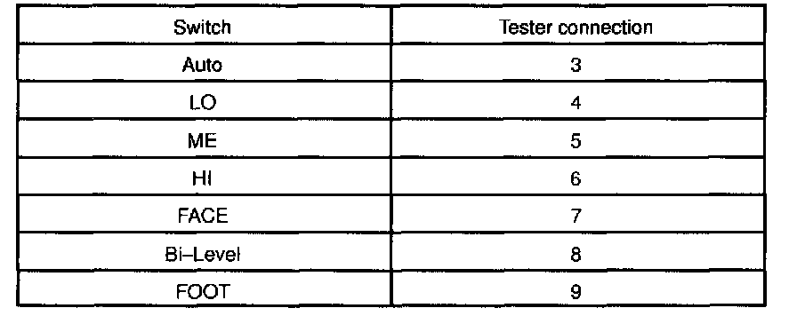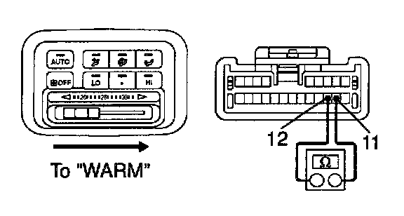 b. Gradually move the temperature control lever from "COOL" side to "WARM" side then check that the resistance between terminals 11 and 12 increase from 0 to 3.0 K Ohms.