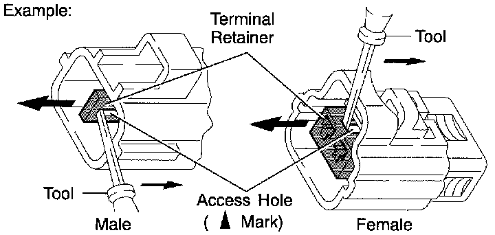 Insert the special tool into the terminal retainer access hole (Mark) and pull the terminal retainer up to the temporary lock position.