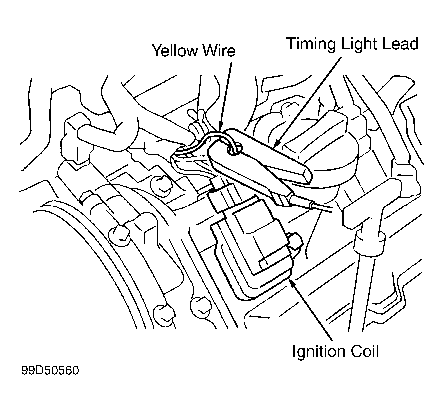 2. Connect timing light lead to Yellow wire at ignition coil electrical connector on top of driver's side valve cover at cylinder No. 1. See Fig 1. Cylinder No. 1 is front cylinder on left side of engine when viewed from flywheel end of engine. See Figure.