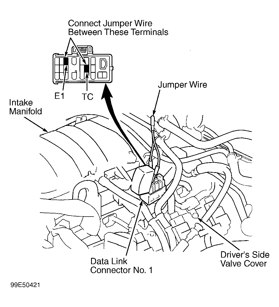 4. Install Jumper Wire (SST 09843-18020) between terminals TC and E1 on data link connector No. 1. See Fig 2. Data link connector is located at near center of intake manifold and driver's side valve cover.