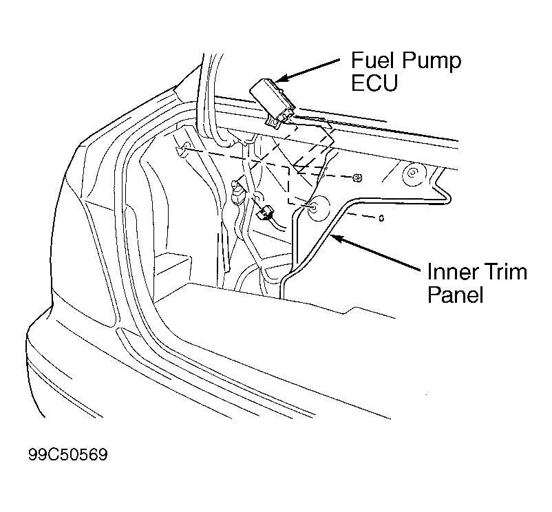 Fuel pump operating speed is controlled by operating condition of the engine such as: starting, idling, light load or heavy load. Engine Control Module (ECM) delivers an input signal from FPC terminal on ECM to FPC terminal on fuel pump ECU in accordance with engine operating condition. Fuel pump ECU uses this input signal to determine how much voltage should be delivered to fuel pump for varying fuel pump operating speed. When engine starts or is under heavy load with engine at high speed, ECM delivers about 3.8-volt input signal to fuel pump ECU. Fuel pump ECU then provides battery voltage to fuel pump so fuel pump operates at high speed. When engine is under heavy load with engine at low speed, ECM delivers about 2.5-volt input signal to fuel pump ECU. Fuel pump ECU then provides about 10 volts to fuel pump so fuel pump operates at medium speed. When engine is idling or under light load, ECM delivers about 1.3-volt input signal to fuel pump ECU. Fuel pump ECU then provides about 8.5 volts to the fuel pump so fuel pump operates at low speed. Fuel pump ECU is located behind inner trim panel at driver's side rear corner of the trunk. See Fig 1.