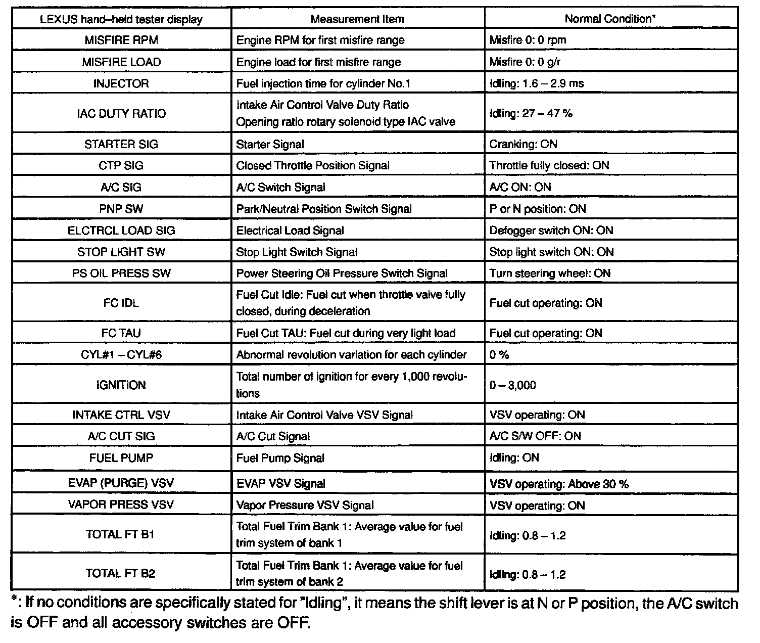 ENGINE OPERATING CONDITIONNOTE: The values given below for "Normal Condition" are representative values, so a vehicle may still be normal even if its value varies differ from those listed here. So do not decide whether a part is faulty or not solely according to the "Normal Condition" here.