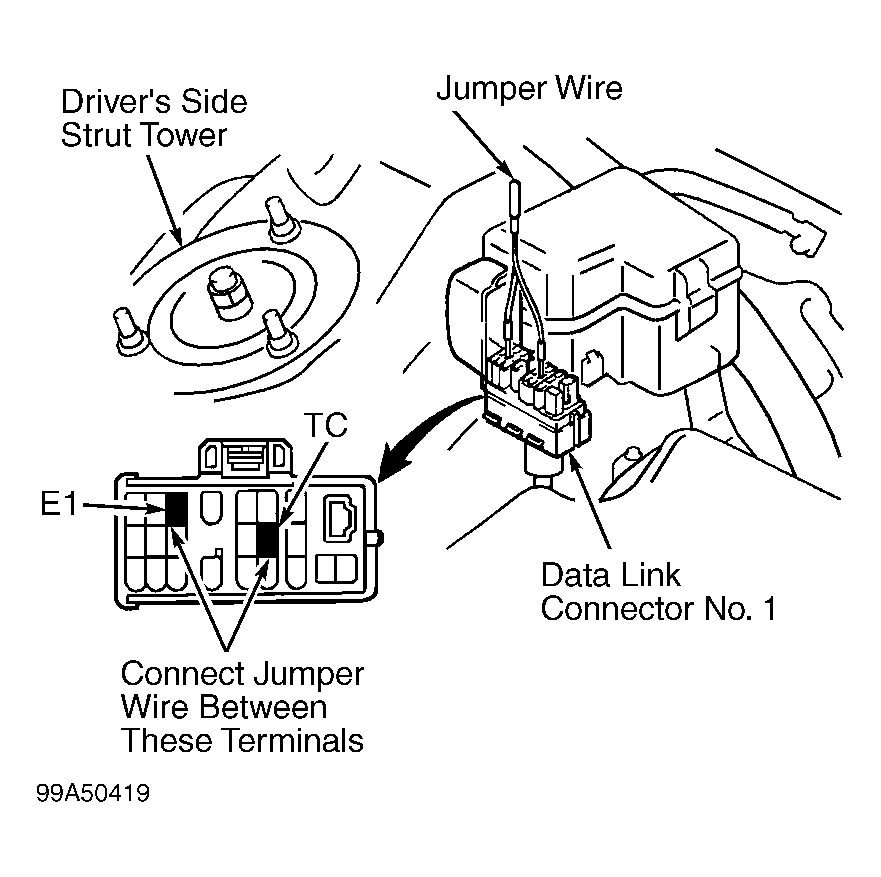 3. Install Jumper Wire (SST 09843-18020) between terminals TC and E1 on data link connector No. 1. See Fig 2. Data link connector is located near driver's side strut tower. Apply parking brake. Place transmission in Neutral. Start engine and allow engine to idle.