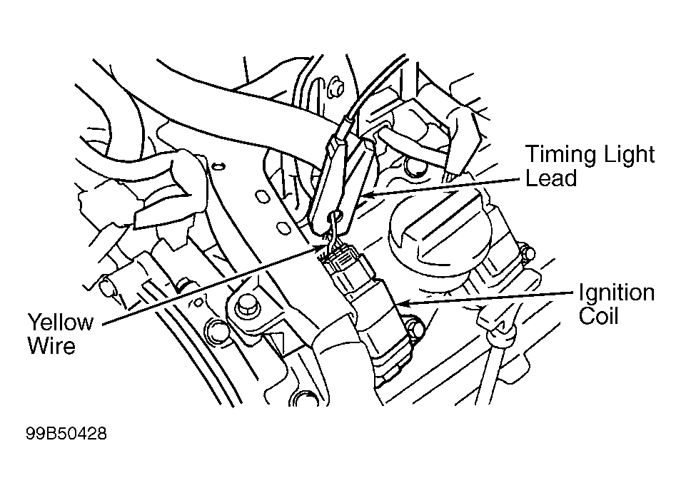 2. Connect timing light lead to Yellow wire at ignition coil electrical connector on top of driver's side valve cover at cylinder No. 1. See Fig 1. Cylinder No. 1 is front cylinder on left side of engine when viewed from flywheel end of engine. See Figure.